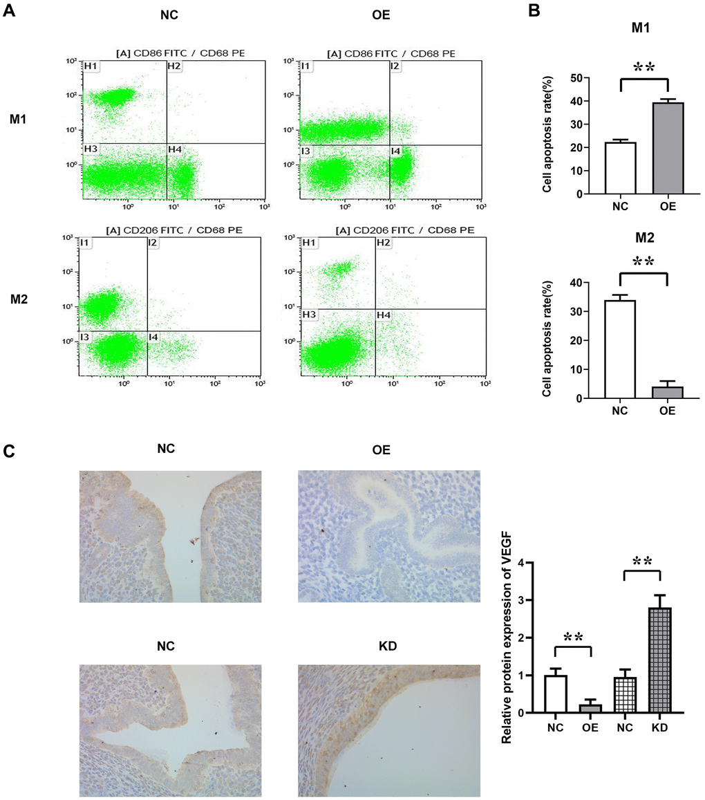 Figure 3. The proportion of M1 and M2 polarization in macrophages was detected by flow cytometry. (A) Flow cytometry results. (B) Statistics of the proportion of M1 and M2 polarization in macrophages; (C) Immunohistochemical staining results and relative protein expression statistics of VEGF. N = 8; **P < 0.01.