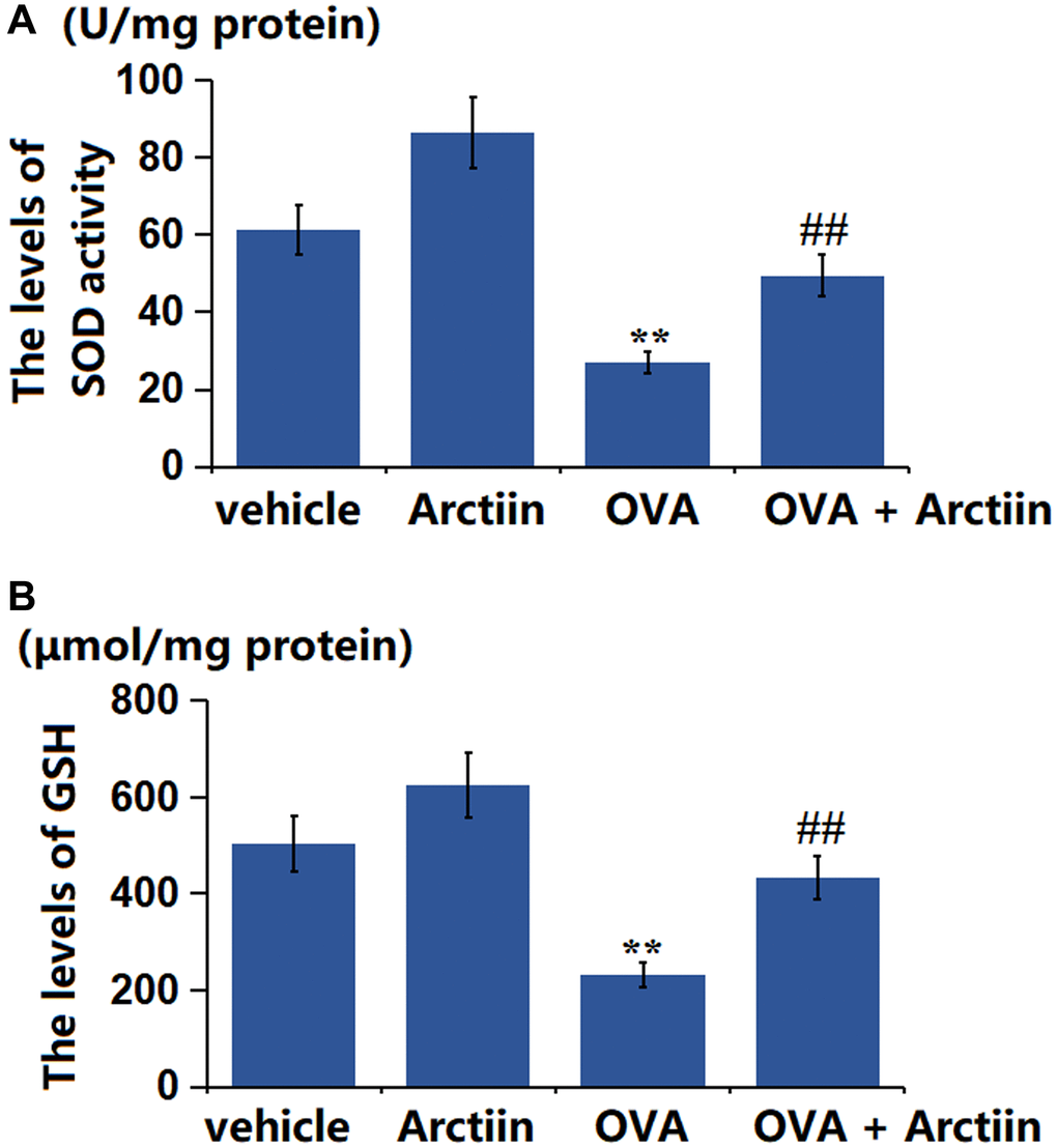 The SOD activity was found greatly increased from 61.3 U/mg protein to 86.6 U/mg protein in the Arctiin group and significantly decreased to 26.9 U/mg protein in the OVA group, which was markedly reversed to 49.5 U/mg protein in the OVA+ Arctiin group (Figure 6A). Moreover, the GSH level in the control, Arctiin, OVA, and OVA+ Arctiin groups was 503.6, 623.8, 232.5, and 433.7 μmol/mg protein, respectively (Figure 6B). A suppressive property of Arctiin on OS in the lung tissues was observed in OVA-challenged mice.