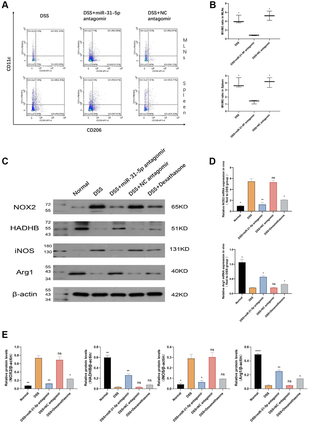 Figure 7. mir-31-5p antagomir may alleviate colitis in mice by transforming M1-type macrophages into M2-type macrophages. (A) The ratio of M1/M2 in spleen and lymphocytes was determined by flow cytometry. (B) Statistical analysis of M1/M2 ratio in spleen and lymphocytes. (C) The expressions of NOX2, HADHB, iNOS, Arg1 and β-catenin proteins in colon were analyzed by Western blotting. (D) The mRNA expression of M1-type and M2-type macrophage marker genes was detected by qPCR. (E) Statistical analysis of protein expression levels of NOX2/β-actin, HADHB/β-actin, iNOS2/β-actin and Arg1/β-actin. Each bar represents mean ± SD, n ≥ 5 from each group. Ns represented P > 0.05, *P < 0.05, **P < 0.01, ***P < 0.001, ****P < 0.0001 vs. DSS group.