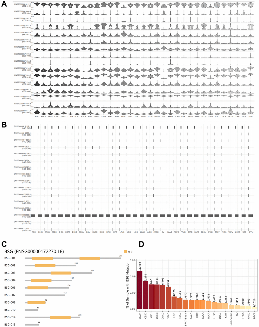 BSG isoform profile and mutation in pan-cancers