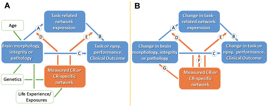 Figure 1. Cross-sectional (A) and longitudinal (B) models for studying cognitive reserve (CR). (A) Measures of brain morphology, integrity or pathology may impact clinical status via path Ⓒ. CR is represented by the orange box; working measures of CR include CR proxies or identified CR brain networks. Age, genetics and life experiences are believed to influence brain measures and CR. CR is assumed to moderate the effect of brain status on clinical status, thus producing individual differences in the clinical correlates of a given level of brain reserve and brain pathology. The effect of brain status on clinical status may be mediated in part by brain networks captured during task related activation (paths Ⓐ and Ⓑ). Path Ⓓ suggest that CR might moderate between brain status and activation. Path Ⓔ recognizes that some aspects of CR might moderate between brain and clinical function without being captured in specific task-related activations. (B) In longitudinal models, two paths can be added: path Ⓕ assesses how CR moderates the effect of brain change on cognitive change, and path Ⓖ addresses neuroprotective mechanisms. Npsy., neuropsychological. Adopted from [7].