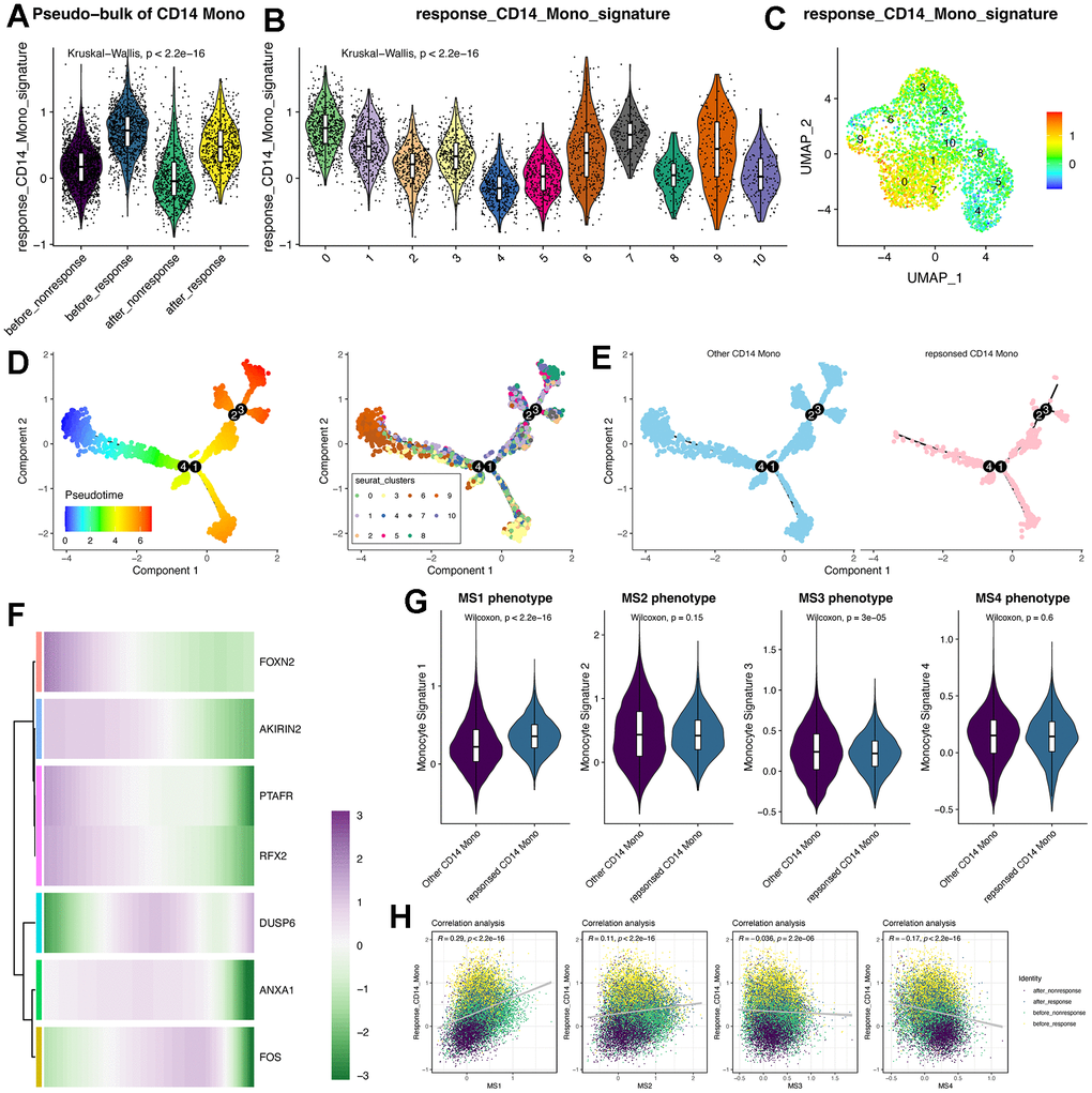 Figure 4. Trajectory analysis of CD14+ monocytes and the pseudotime changes of the feature genes identified by machine learning algorithms. (A) Violin plot displays the response-related CD14+ monocyte signature in pseudo-bulk levels of CD14+ monocytes. (B) Violin plot displays the response-related CD14+ monocyte signature across all identified subclusters of CD14+ monocytes. “AddModule” function in Seurat package was leveraged to estimate the signature score. (C) Signature score of response-related CD14+ monocytes was mainly activated in cluster 0. (D) Trajectory analysis of CD14+ monocytes. Monocle2 package was adopted. (E) Pseudotime distribution of other and response-related CD14+ monocytes. (F) Expression changes of the feature genes following pseudotime. (G) Violin plot shows the monocyte signature scores. MS: monocyte signature. (H) Correlation analysis between the response signature and the other four published MS phenotypes.