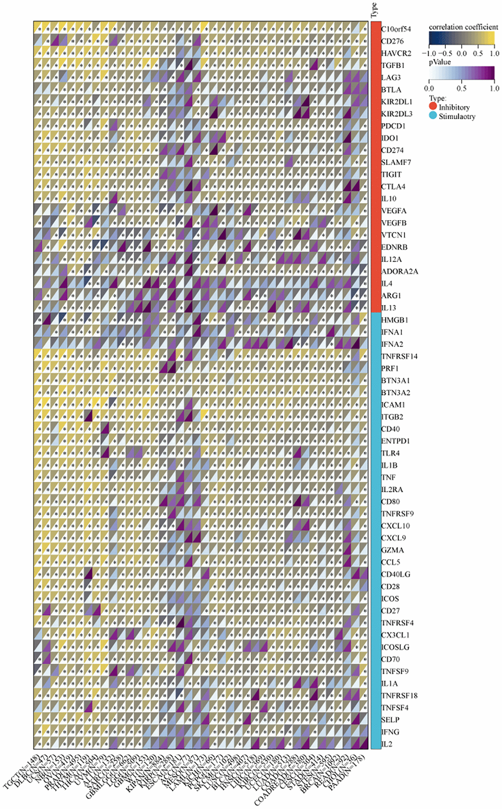 We utilized the SangerBox tool to investigate the association between MVP expression and infiltration by six immune cell types (B cells, CD8+ T cells, CD4+ T cells, macrophages, neutrophils, and dendritic cells) across 38 diverse TCGA cancer types. Our findings revealed significant positive correlations between MVP expression and immune cell infiltration in PRAD, PCPG, LIHC, TGCT, OV, LUSC, BRCA, SKCM, SARC, and PCPG. Conversely, only in thymoma (THYM) and KIRP, a significant negative correlation was observed between MVP expression and invasion by tumor-infiltrating immune cells (Figure 6A). These results indicate a positive correlation between MVP expression levels and tumor immune responsiveness in most tumor types. Additionally, we examined the correlation between MVP expression levels and infiltration by immunosuppressive cells (MDSC, CAF, and Treg cells). The results showed that MVP expression was negatively correlated with MDSC infiltration in most tumors. In contrast, MVP expression exhibited a positive correlation with CAF and Treg cell infiltration in BRCA, COAD, GBM, TGCT, thyroid carcinoma (THCA), THYM, and other tumors (Figure 6B). Furthermore, we compared the predictive ability of MVP with standardized biomarkers in relation to response outcomes and OS in ICB sub-cohorts. Remarkably, MVP alone exhibited an area under the receiver operating characteristic curve (AUC) of ≥0.5 in 15 out of the 25 ICB sub-cohorts (Figure 6C). Compared to the MIS score, TMB, T. Clonality, and B. Clonality, MVP demonstrated superior predictive value. Additionally, we conducted an analysis of the relationship between MVP and 60 immune checkpoint modulators (divided into two classes: Inhibitory and Stimulatory) across 40 cancer types. Our findings indicate a predominant positive correlation between MVP expression and immunomodulators in the majority of tumors (Figure 7).