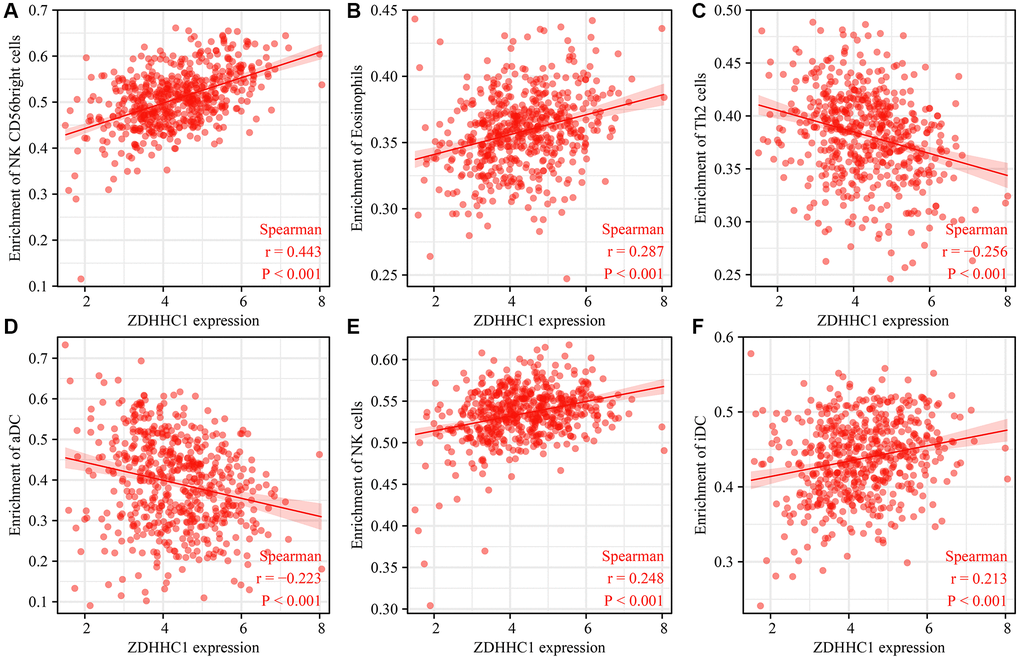 Figure 15. Correlation between ZDHHC1 overexpression and RNA modification genes. (A) IGF2BP1; (B) IGF2BP2; (C) FTO; (D) NOP56; (E) NOP58; (F) ALKBH5. Abbreviations: ZDHHC1, zinc finger DHHC-type containing 1; IGF2BP1/2, insulin like growth factor 2 mRNA binding protein 1/2; FTO, FTO alpha-ketoglutarate dependent dioxygenase; NOP56/58, NOP56/58 ribonucleoprotein; ALKBH5, ALKB homolog 5.