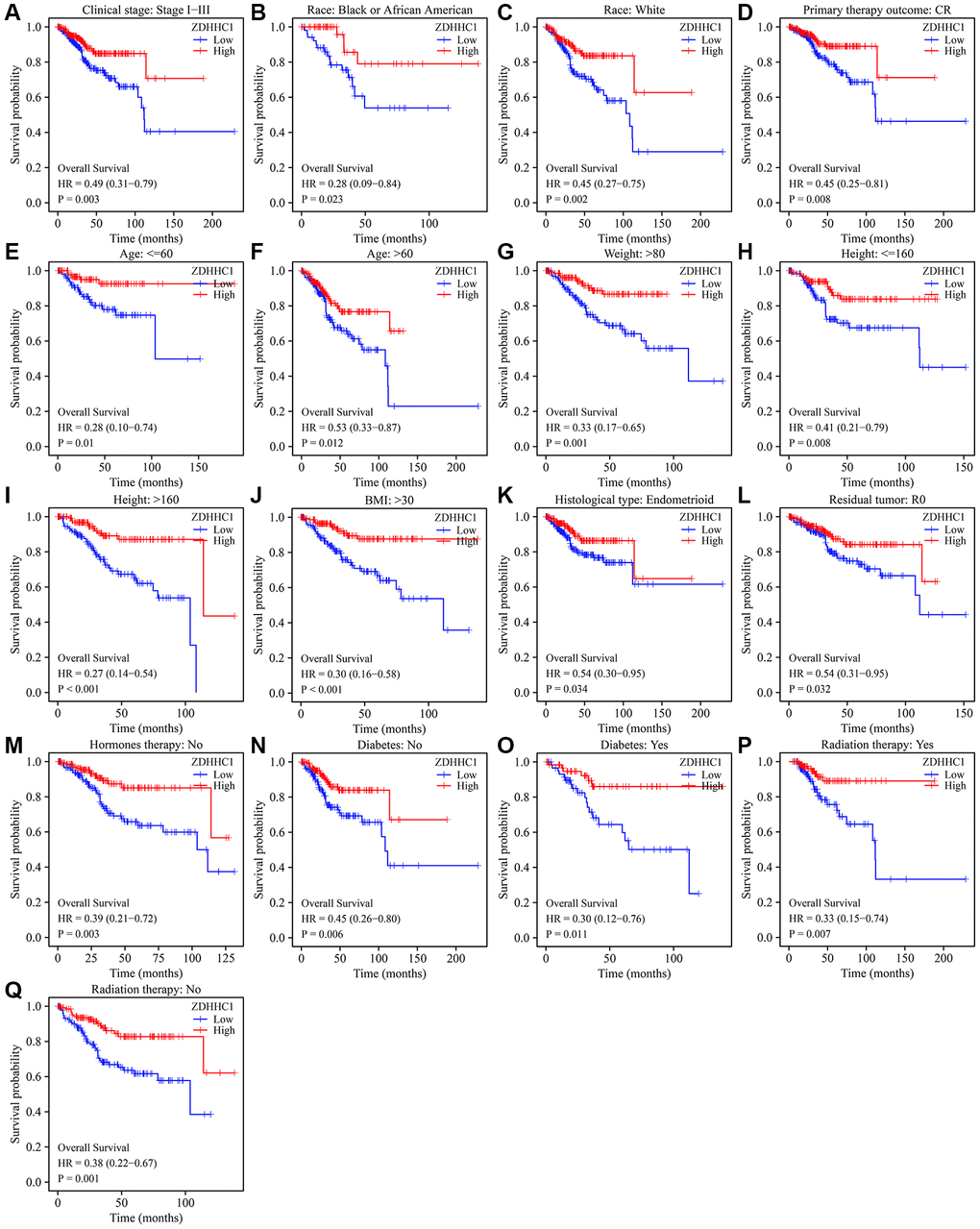 Figure 4. ZDHHC1 expression is associated with poor survival in subgroups of patients with UCEC. (A) Tumor stage I–III. (B) Black or African American. (C) White. (D) CR. (E) Age ≤60. (F) Age >60. (G) Weight >80 kg. (H) Height ≤160 cm. (I) Height >160 cm. (J) BMI >30. (K) Histological type of endometrioid. (L) R0. (M) Without hormone therapy. (N–O) With/without diabetes. (P, Q) With/without radiation therapy. Abbreviations: UCEC: uterine corpus endometrial carcinoma; ZDHHC1: zinc finger DHHC-type containing 1; CR: complete response; BMI: body mass index.