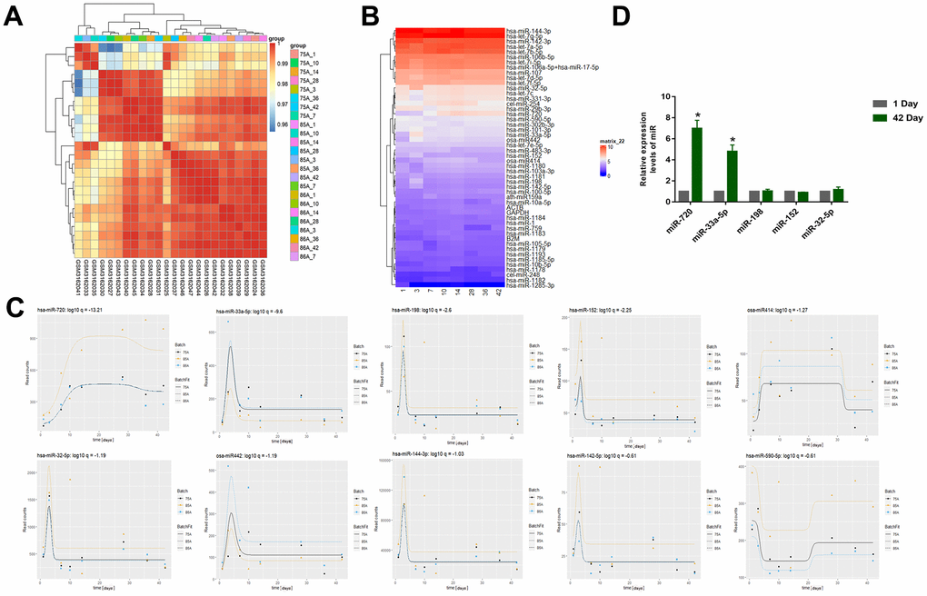 Figure 1. (A) Correlation Heatmap of samples (GSE114990). (B) Heatmap of miRNA expression (GSE114990) (The abscissa represents days of storage). (C) The top 10 miRNAs that changed significantly with storage time were miR-720, miR-33a-5p, miR-198, miR-152, miR414, miR-32-5p, miR442, miR-144-3p, miR-142-5p, miR-590-5p. (D) The qRT–PCR to examine the top five miRNAs using qRT-PCR of the RBC samples we collected from the donors. All data are means ± SD; n = 3 (*P<0.05).