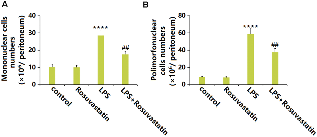 Subsequently, the migration of immune cells was evaluated. The number of mononuclear cells in the peritoneum was slightly decreased from 10.3 ×106/peritoneum to 10.1 ×106/peritoneum by Rosuvastatin and significantly increased to 28.6 ×106/peritoneum by LPS stimulation, then markedly reduced to 17.5 ×106/peritoneum in the LPS+ Rosuvastatin group (Figure 3A). Moreover, the number of Polymorphonuclear cells in the control, Rosuvastatin, LPS, and LPS+ Rosuvastatin groups was 8.6, 8.3, 58.5, and 37.6 ×106/ peritoneum, respectively (Figure 3B).