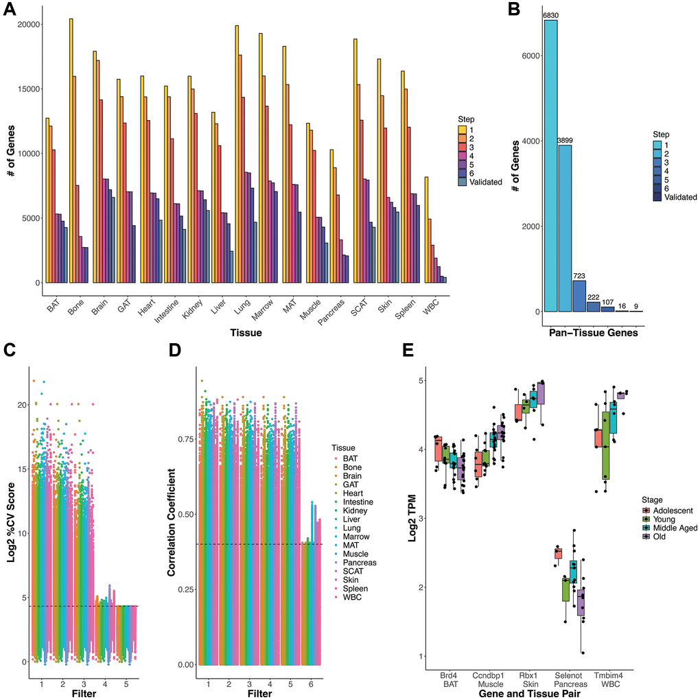 Figure 2. Gene selection process and rationale. (A) Gene count number remaining after each criteria/filter step for each tissue. (B) Count of genes present across all tissues at each step (e.g. pan-tissue) (C) % Coefficient of Variance (CV) for each gene calculated as SD/mean*100 distribution of log2 TPM gene expression values. Genes that satisfy every subsequent filter are plotted by the last filter applied. Filters 1–3 slowly decrease %CV and the cumulative effect of filters 1–4 generally results in a %CV of approximately 20% (marked by the dashed line). Filter 5 imposes a strict %CV <20% requirement for all tissue-gene pairs. (D) Age information must be included in exclusion criteria as low variation genes can still have a high correlation with age. Filter 6 (Spearman correlation p-value based removal) removes highly age-correlated genes. Dashed line corresponds to a correlation coefficient (y-axis) of 0.4, which for most tissues corresponds to a significant correlation with p = 0.05. Exact CV and age correlation information is found in Supplementary Table 2, in case readers wish to utilize other cutoffs in selecting RGs. (E) Log2 TPM (y-axis) values by life stage (color) for specific gene-tissue pairs (x-axis) for genes that satisfy filters 1–5, but are eliminated by filter 6. Boxplot line represents the group median while lower and upper limits of the boxplot correspond to the first (25%) and third (75%) quartiles.