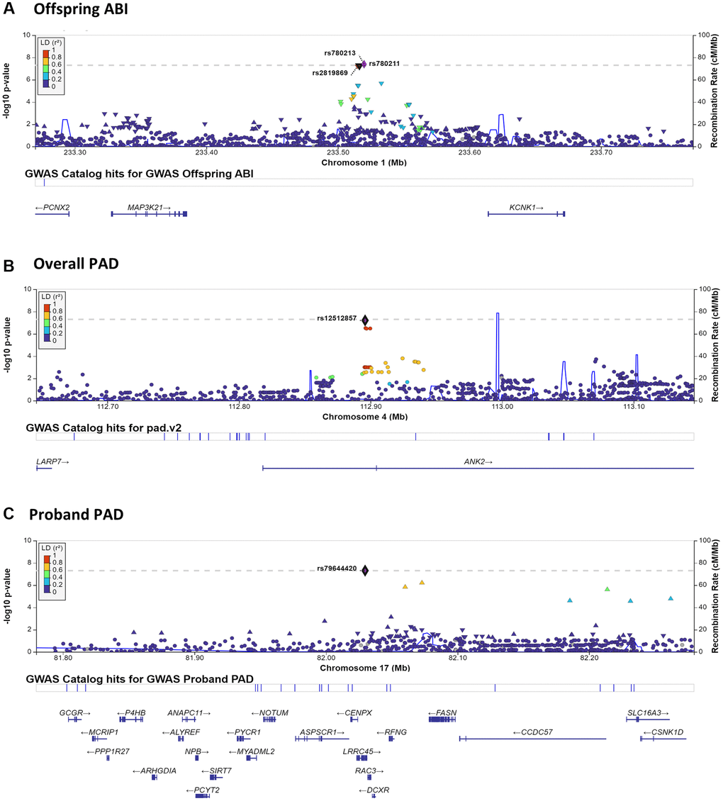 Figure 1. LocusZoom plots surrounding notable GWAS results. LocusZoom plots are shown for each of the three significant or highly suggestive GWAS results shown in Table 3. Plots include 250 KB up- and down-stream of the index SNP. Results by panel include: (A) chromosome 1– Offspring ABI; (B) chromosome 4– Overall PAD; (C) chromosome 17– Proband PAD.