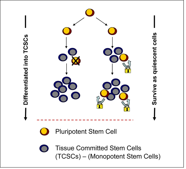 Figure 1. Potential VSEL contribution to tissue rejuvenation. VSELs deposited in adult tissues during embryogenesis/gastrulation may become eliminated after giving rise to TCSCs. Conversely, they may survive among TCSCs and serve as a potential backup/reserve source of TCSCs. Under homoestatic conditions, primitive VSELs should be protected from unleashing their own proliferation.