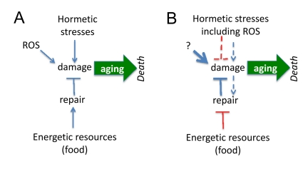 Figure 1. Paradoxical links between damage and aging. (A) If agings is caused by damage, then hormetic damage should accelerate aging. Also food by providing resources should becelerate aging. Both prediction contradict observations, making the model incorrect. (B) Paradoxical model assumes that (a) damage decrease damage and (b) the less resources (food), the more resources can be used for anti-aging repair. These assumptions are paradoxical but nevertheless are needed to fit predictions and observations. Paradoxical links are shown in red.