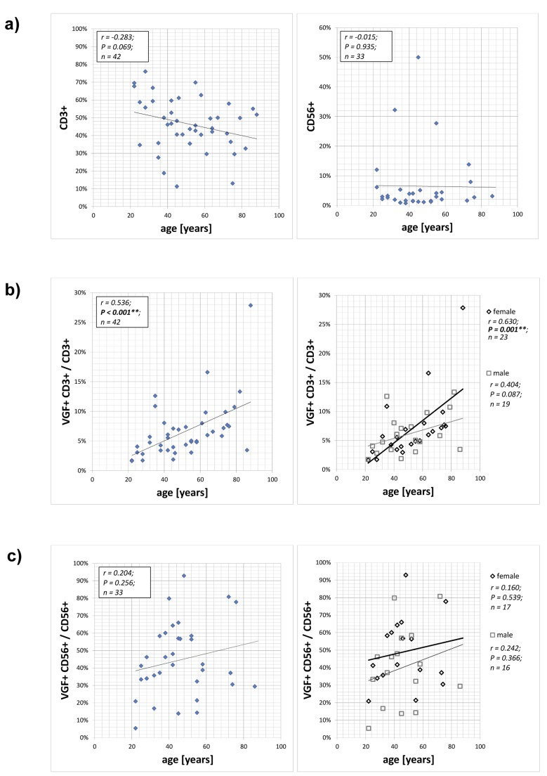 Figure 1. Expression of VGF on CD3+ T cells and CD56+ NK cells. PBMCs isolated from 42 healthy volunteers aged between 22 and 88 years without psychiatric diagnosis were stained with anti-VGF (D20) and anti-CD3 or anti-CD56 and were analyzed using flow cytometry. The numbers of CD3+ T cells and CD56+ NK cells depending on the age of the persons is shown in (a). The frequency of VGF-expressing CD3+ cells within the T lymphocytes population is correlated with the age of the cohort (b; left) and further subdivided according to the gender (b; right). The proportion of VGF-expressing CD56+ cells within the NK cell population is shown in dependence with the age of the cohort (c; left) and further subdivided according to the gender (c; right).