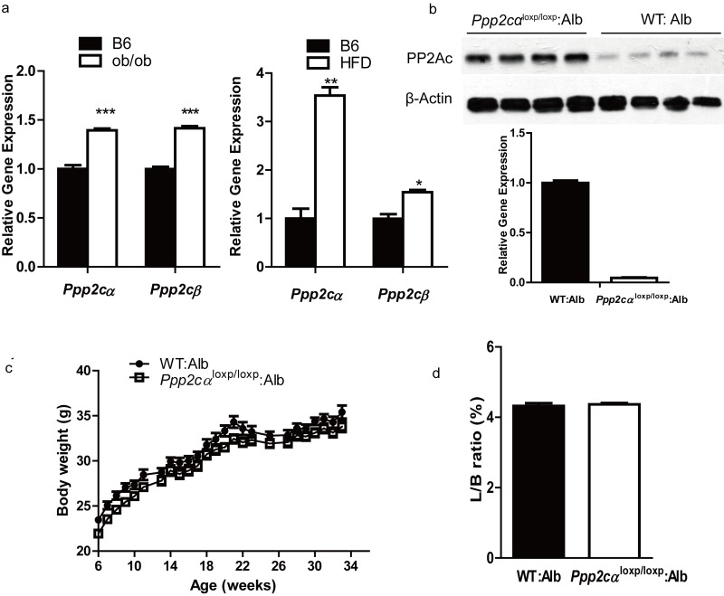 Figure 1. Ppp2cα is highly expressed in two models of insulin resistant and liver-specific deletion of Ppp2cα. (a) Q-PCR was performed to measure Ppp2cα mRNA levels in liver from ob/ob of 8weeks and 16 weeks mice fed HFD beginning at 8 weeks of age compared to appropriate controls (n=5). (b) Deletion efficiency of the Ppp2cα allele was analyzed using Q-PCR and western blotting. (c) Body weight (BW) of mice on a normal chow diet (n=8). BW was monitored every week from 6 weeks of age for 34 weeks. (d) Liver weight (normalized to BW) of 8-week-old mice fed ad libitum (n=8).