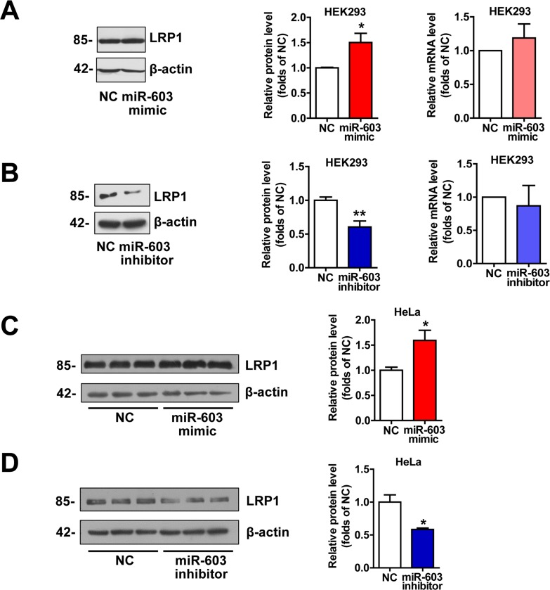Figure 4. miR-603 increases the LRP1 protein levels. (A) Quantitative RT-PCR analysis of mRNA (right) and immunoblot analysis of protein (left) levels of LRP1 following the overexpression of miR-603 in HEK293 cells. (B) Quantitative RT-PCR analysis of mRNA (right) and immunoblot analysis of protein (left) levels of LRP1 following the inhibition of endogenous miR-603 in HEK293 cells. (C, D) Immunoblot analysis of protein levels of LRP1 following the overexpression of miR-603 (C) and the inhibition of endogenous miR-603 (D) in HeLa cells. *P < 0.05, **P < 0.01, ***P < 0.001 versus NC as determined by paired two-tailed Student's t-tests for quantitative RT-PCR analysis and by unpaired two-tailed Student's t-tests for immunoblot analysis.