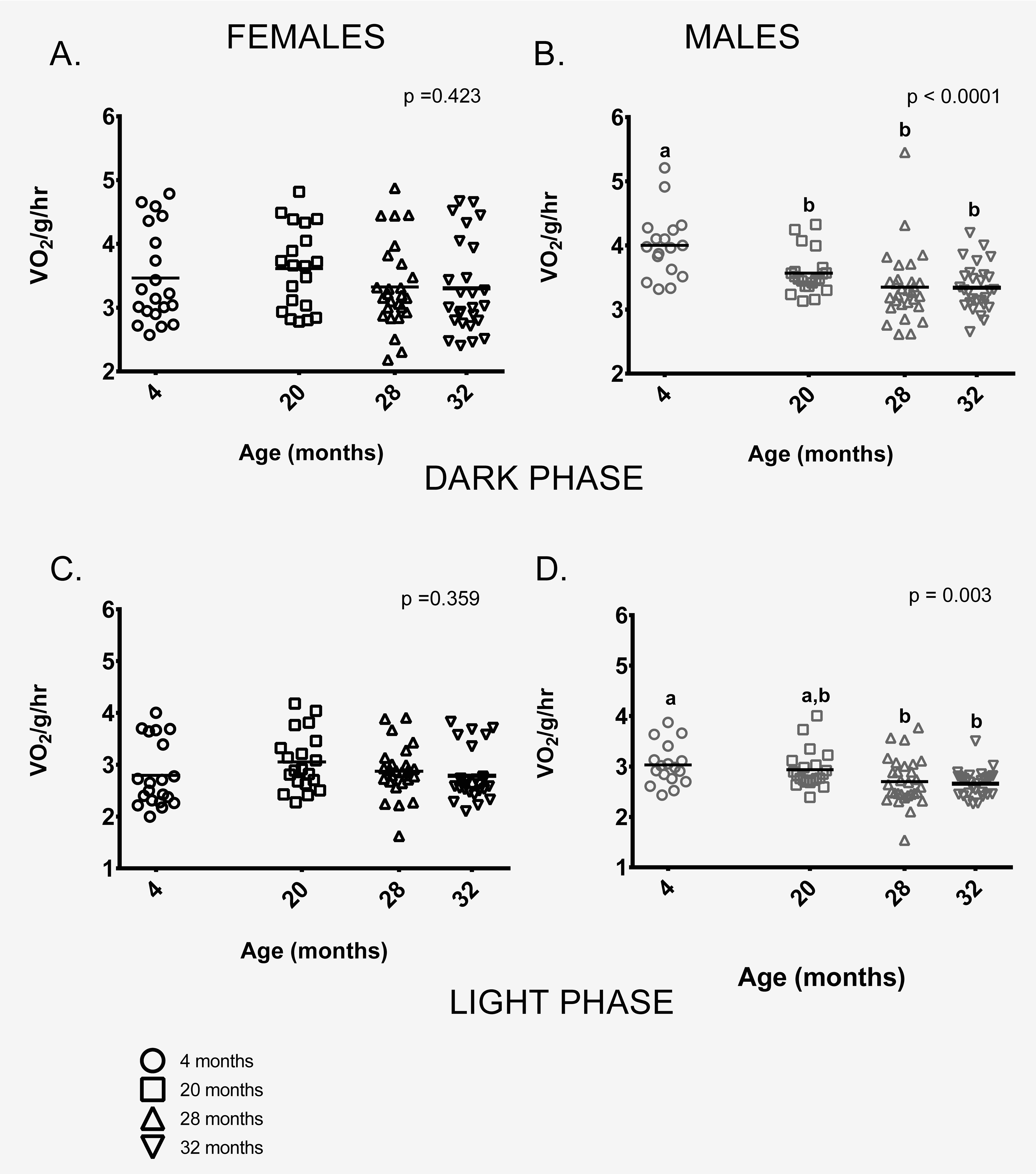 Figure 3. Metabolic rate differed between the age groups in male, but not female mice. (A) Female mice of all ages had similar metabolic rates during the dark (=active) phase. (B) During the dark phase, 4-month -old male mice had higher metabolic rates on average than 20, 28 and 32-month-old males (p = 0.025, p < 0.0001, p < 0.0001 respectively). 20-month-old males also had higher mass-specific metabolic rates compared to 28 and 32-month-olds (p = 0.002 in both cases). 28 and 32- month-old males did not differ (p > 0.999). (C) Female mice of all ages had similar metabolic rates during the light (=inactive) phase (p = 0.943). (D) During the light phase, 4-month -old male mice had higher metabolic rates on average than 28 or 32-month-old males (p = 0.033, p = 0.012, respectively), as did 20-month-old males (p = 0.002, p = 0.010, respectively). 28 and 32- month-old males did not differ from one another (p > 0.999). Post-hoc tests subject to Bonferroni correction for multiple comparisons. Metabolism sample size: Females n = 20, 20, 26 and 26 for 4, 20, 28 and 32 months; Males n = 17, 21, 29 and 28 for 4, 20, 28 and 32 months.