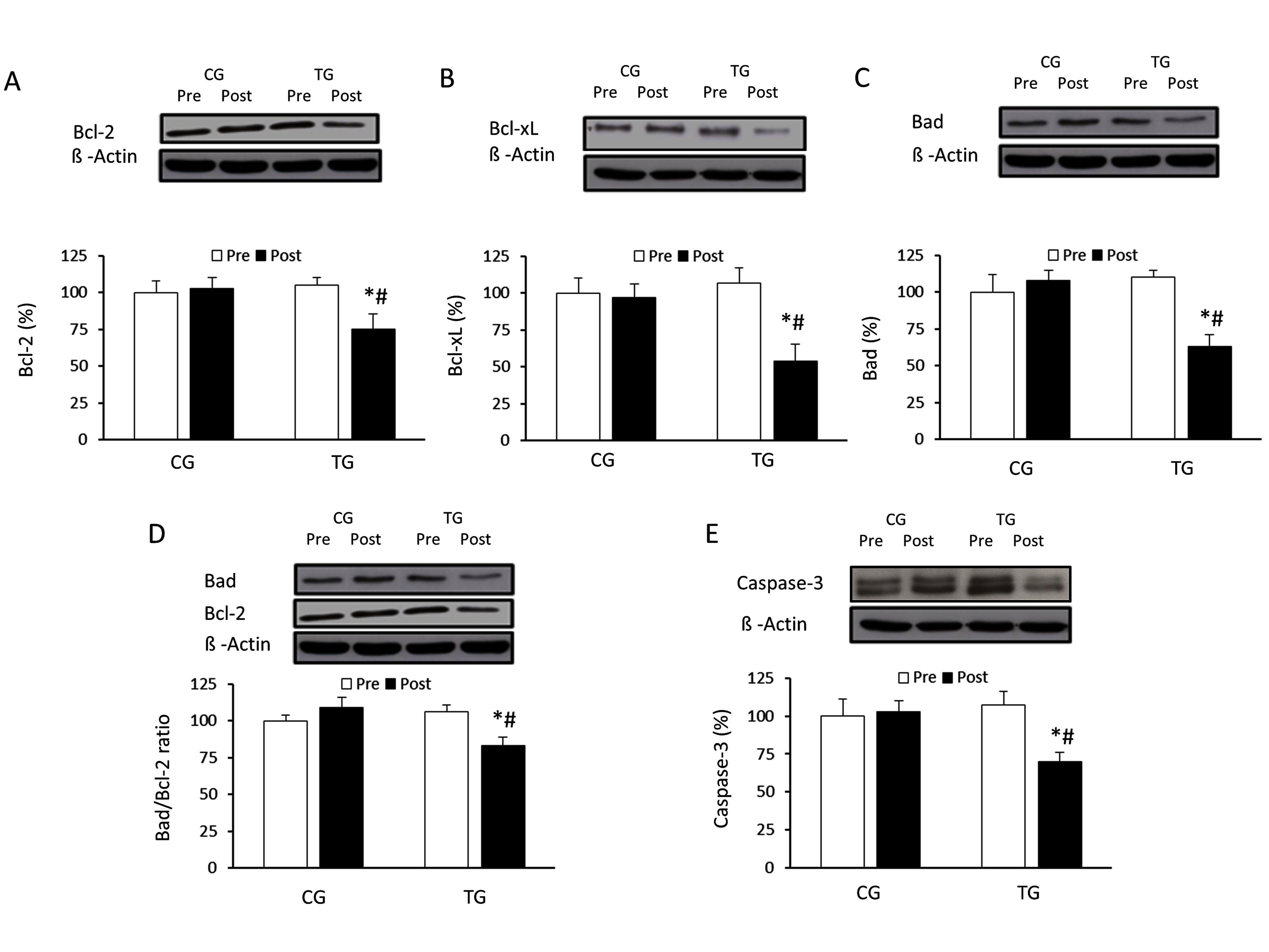 Figure 5. Effects of resistance training on BcL-2, Bcl-xL, and Bad expression and cleaved caspase-3. Representative Western blots and densitometric quantification of Bcl-2 (A), Bcl-xL (B), and Bad (C), Bad/Bcl-2 ratio (D) and cleaved caspase-3 (E) in PBMCs in response to 8 weeks of resistance training for TG and the same period of normal daily routines for CG. Protein from PBMCs was separated by sodium dodecyl sulfate-polyacrylamide gel electrophoresis, followed by immunoblotting. Equal loading of proteins is illustrated by β-actin bands. Values are means ± SEM.*p<0.05 vs. CG; #p<0.05 vs. Pre within a group.