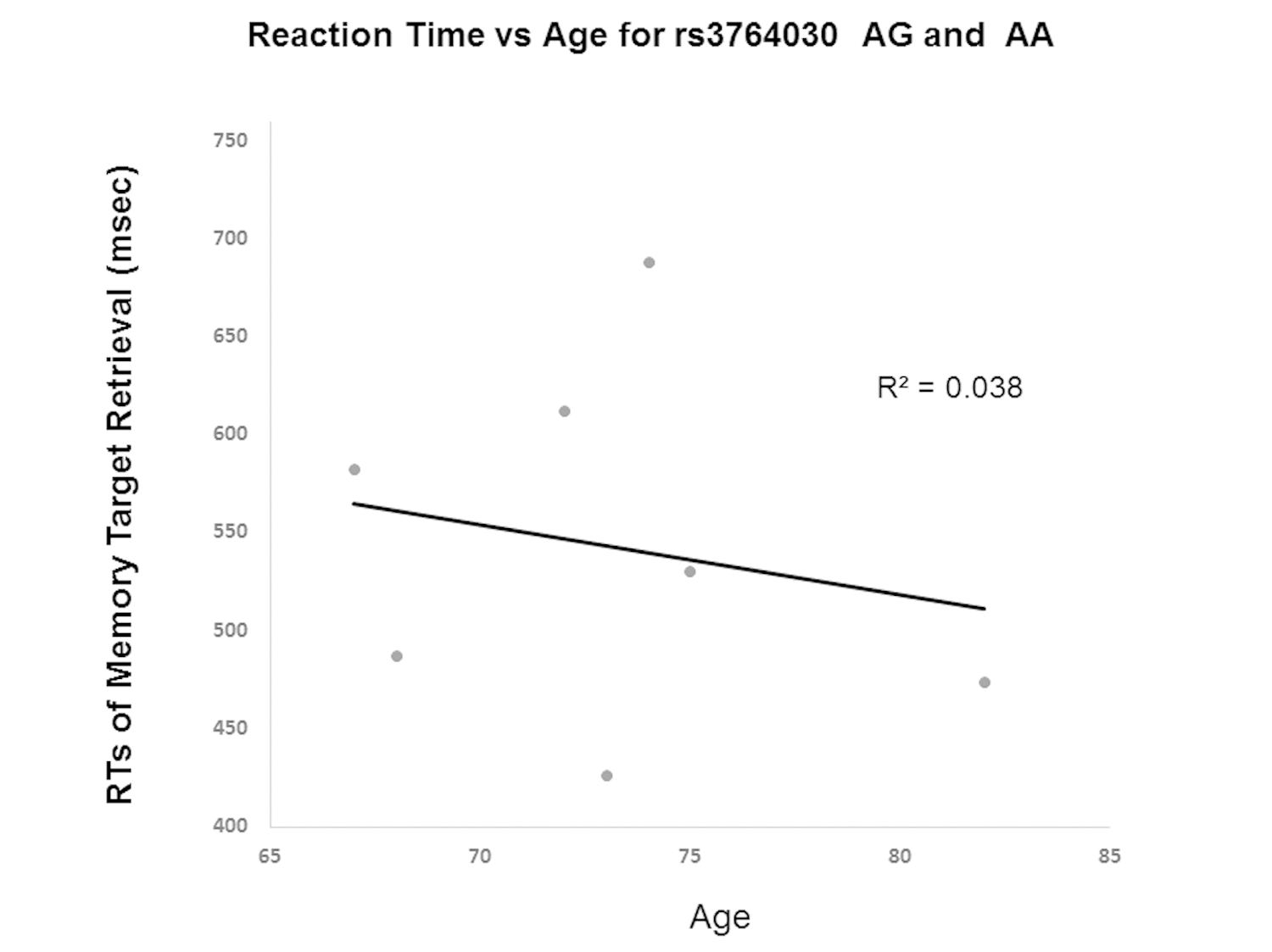 Figure 5. Reaction time in Experiment 2 participants with increasing age based on A allele carrier status (AA and AG genotypes). A significant difference in the slopes of the regression lines was observed for A allele carriers (-3.58 ± SE 0.21) versus the GG genotype (13.1 ± SE 0.20) (p < 0.001).