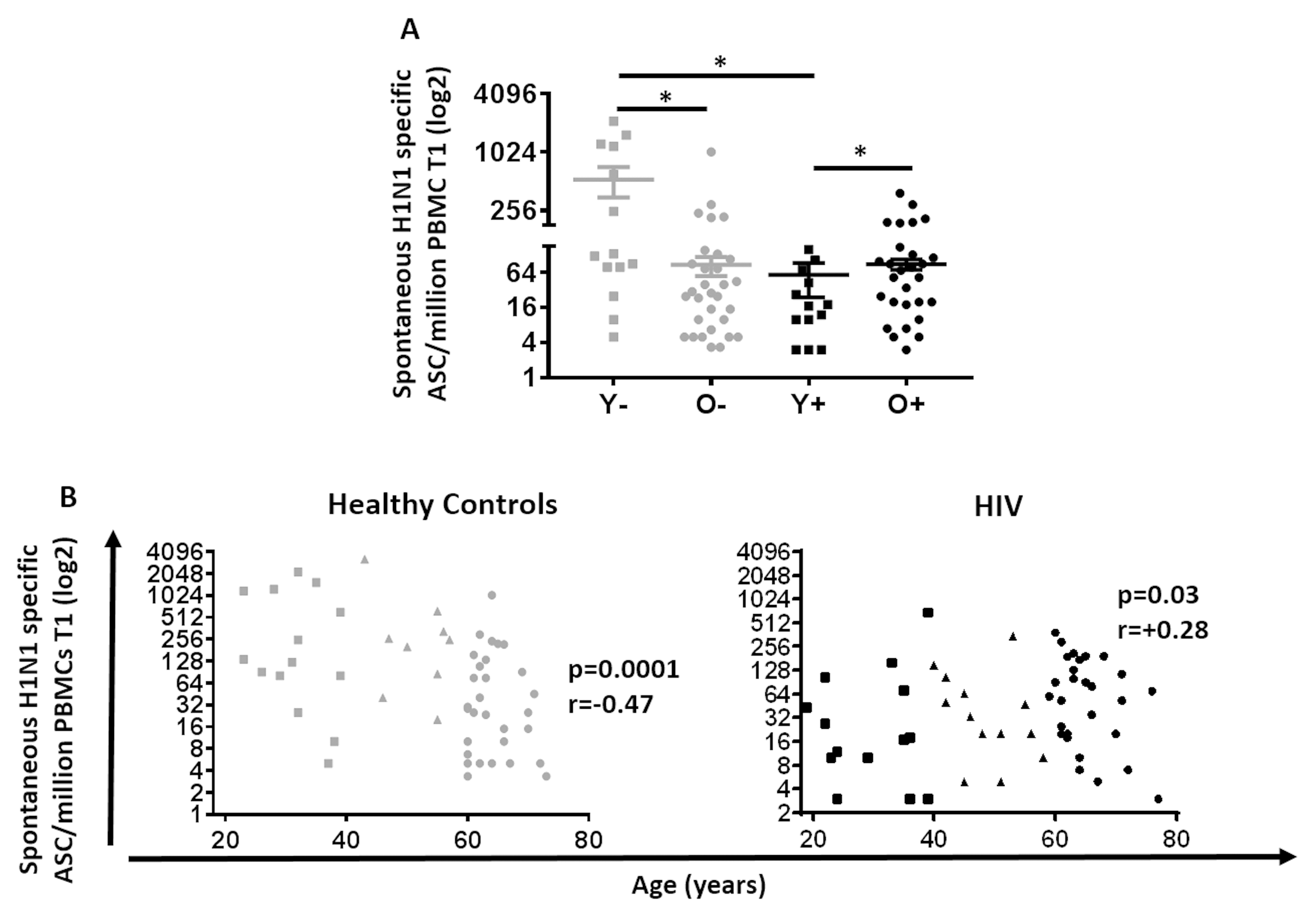 Figure 2. Spontaneous H1N1-specific ASCs at T1 in HIV (Black) and HC (Grey). (A) Mean ±SEM of H1N1 specific spontaneous ASC was assessed by ELISpot using PBMC 7 days after vaccination without any pre-activation. Mann-Whitney test was performed; *, Statistical significance at p <0.05. (B) H1N1 specific spontaneous ASC assessed in 60 Healthy controls (Left) and 64 HIV infected individuals (Right). ELISpot values are expressed as log2 scale. Age groups depicted as squares (young, <40 years), triangles (middle, 40-59 years) and circles (old, ≥60 years). Spearman correlation was performed.