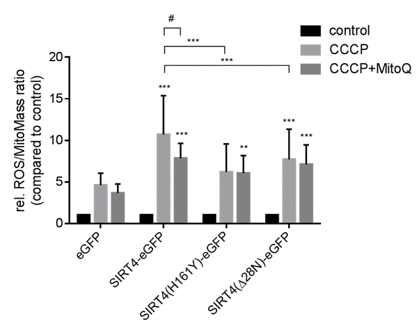 Figure 1. Catalytically active SIRT4-eGFP increases mitochondrial ROS production after CCCP-induced mitochondrial uncoupling. HEK293 cell lines stably expressing eGFP, SIRT4-eGFP, SIRT4(H161Y)-eGFP, or SIRT4(Δ28N)-eGFP were treated with CCCP (10 nM) for two hours either with or without pretreatment with MitoQ (100 nM; 16 hours). Thereafter cells were stained with the cell-permeant dyes MitoTracker® Deep Red and MitoSOX™ Red followed by flow cytometric analysis. Shown are mean ± s.d. values from nine experiments. To evaluate statistical significance (comparison of eGFP vs. wild-type or mutant SIRT4 or comparisons indicated by brackets) two-way ANOVA followed-up by Tukey’s test were performed (**p<0.01; ***p<0.001). The effect of MitoQ treatment was evaluated using a paired t-test (#p<0.05).