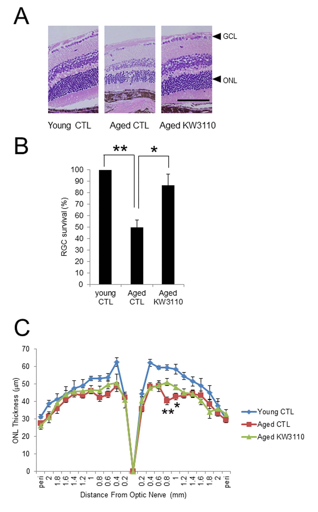 Figure 5. Protective effect of Lactobacillus paracasei KW3110 on age-induced histological changes and ganglion cell loss in the retina. (A) Hematoxylin and eosin staining of retinal sections in young mouse (3-months-old) fed a control (CTL) diet and aged mice (22-months-old) fed a diet either with or without L. paracasei KW3110 (KW3110 diet). Arrow heads indicate the ganglion cell layer (GCL) and outer nuclear layer (ONL), respectively. Scale bar represents 100 μm. (B) The survival rate of retinal ganglion cells (RGCs) in aged mice (22-months-old) fed a diet either with or without L. paracasei KW3110 (KW3110 diet) were analyzed compared to the survival of RGCs in young mice (3-months-old) fed a control diet. Values are presented as the means ± SEM. Significance was assumed if the p value was < 0.05. **p < 0.01. (C) ONL thickness was lower in aged mice (22-months-old) fed control diet than in aged mice fed a diet with L. paracasei KW3110. Values are presented as the means ± SEM. Significance was assumed if the p value was < 0.05. *p < 0.05; **p < 0.01.