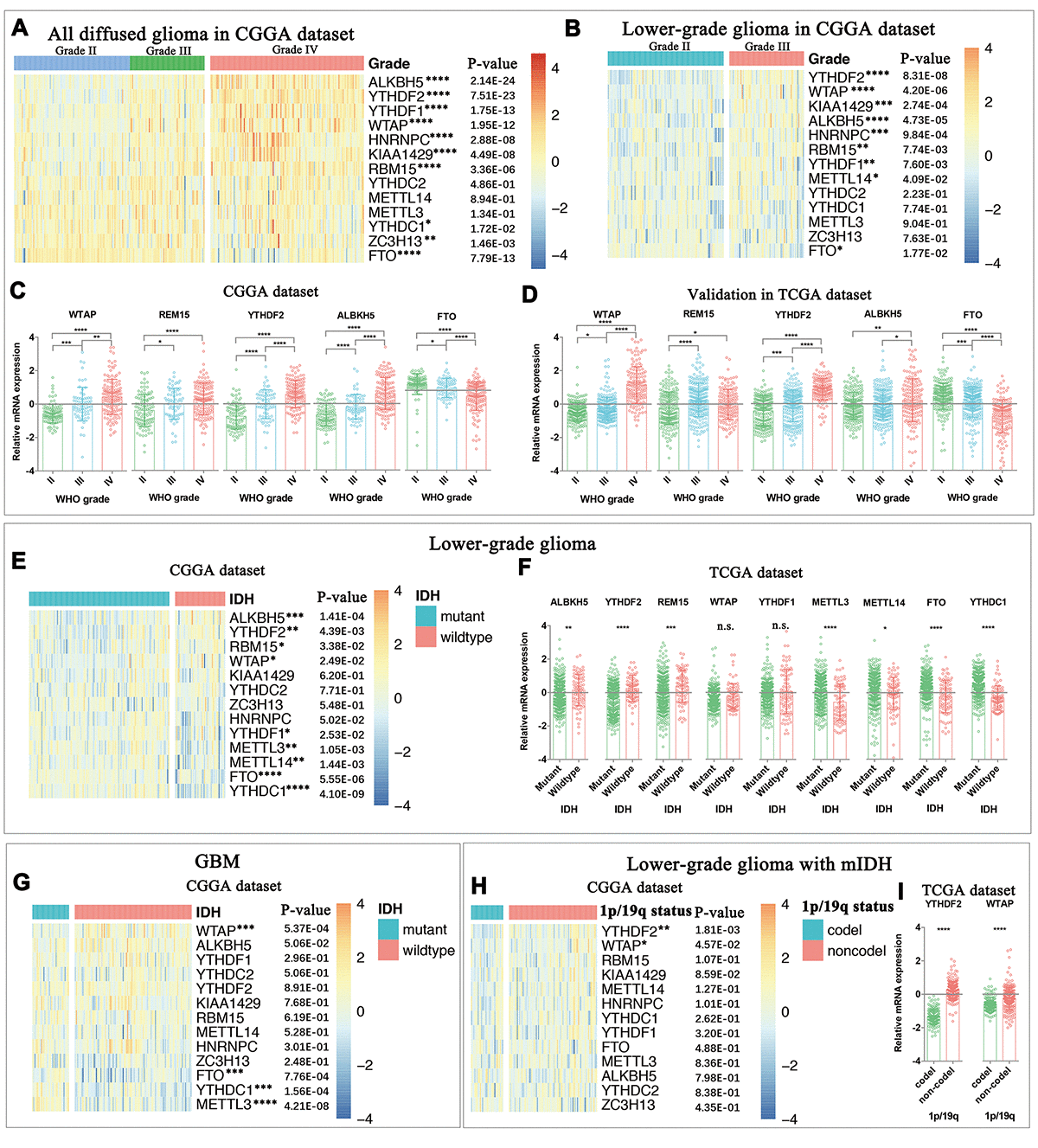 Figure 1. Expression of m6A RNA methylation regulators in gliomas with different clinicopathological features. (A-D) The expression levels of thirteen m6A RNA methylation regulators in gliomas with different WHO grades. (E-F) The expression levels of m6A RNA methylation regulators in LGG with different IDH status. (G) The expression levels of m6A RNA methylation regulators in GBM with different IDH status. (H) The expression levels of m6A RNA methylation regulators in IDH-mutant (mIDH) LGG with different 1p/19q codeletion status. * P < 0.05, ** P < 0.01, *** P < 0.001 and **** P < 0.0001.