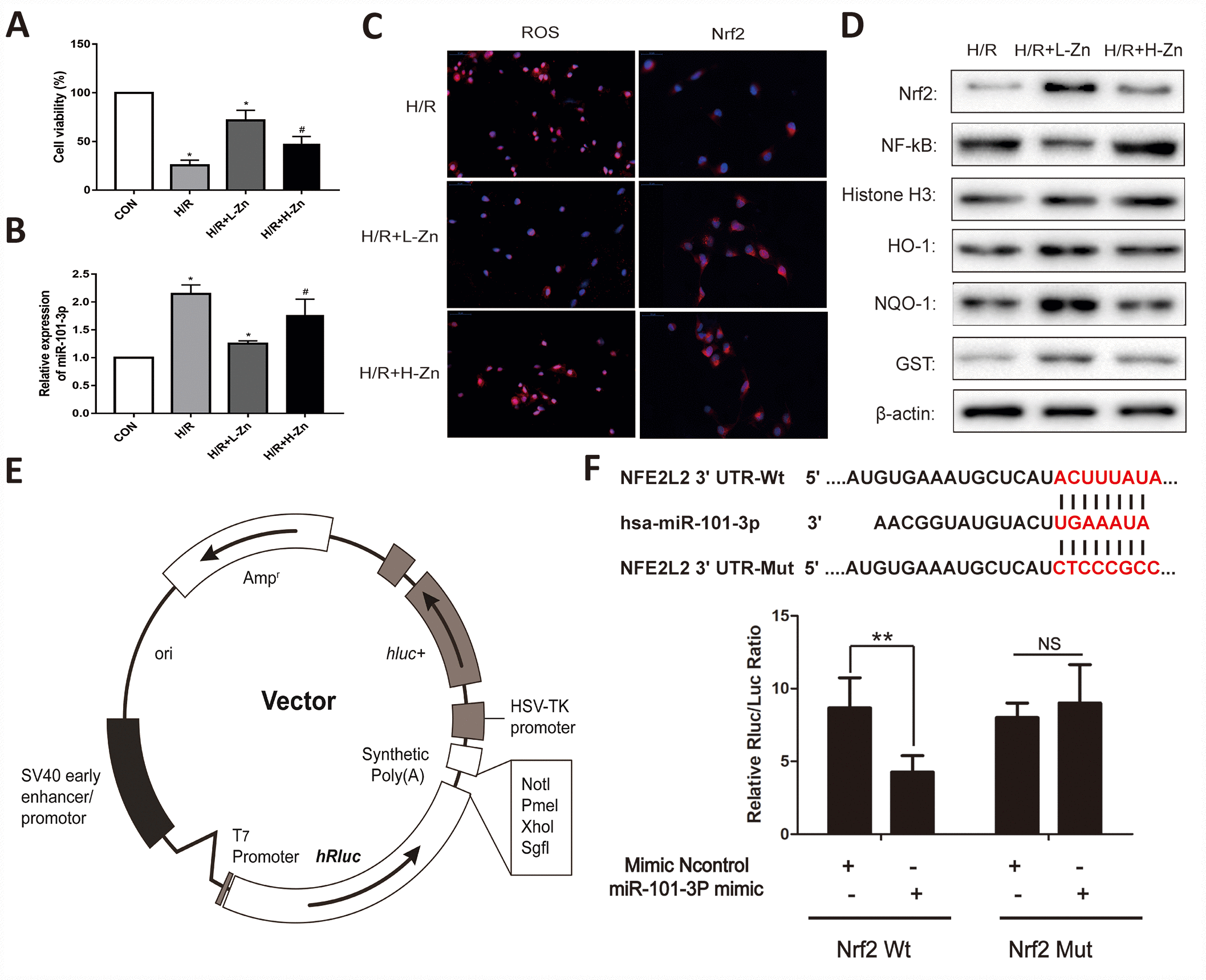 Figure 5. Zinc up-regulated miR-101-3p via Nrf2/HO-1 signaling pathways in TM3 Hypoxia/Reoxygenation (H/R) model. (A) Cell viability of TM3 in Control, H/R injury, and H/R injury treated with Zinc groups. (B) MiRNA-101-3p expression level in H/R with or without Zinc pretreatment groups. (C) The intracellular ROS and Nrf2 levels in H/R with or without Zinc pretreatment groups. (D) Protein levels of Nrf2, NF-κB, HO-1, NQO-1 and GST of TM3 in different groups. Histone H3 and β-actin were used as a protein control to normalize volume of protein expression. (E) The construction diagram of the target genes (Nrf2) double-luciferase reporter genes. (F) The relative luciferase expression with Nrf2 3′-UTR after co-transfection with miR-101-3p mimics or NC mimics in TM3. Data are expressed as mean±SD. *significant difference vs. Control group (P< 0.05); #significant difference vs. H/R group (P< 0.05); **p < 0.01 compared with NC group; ns indicated no significance.