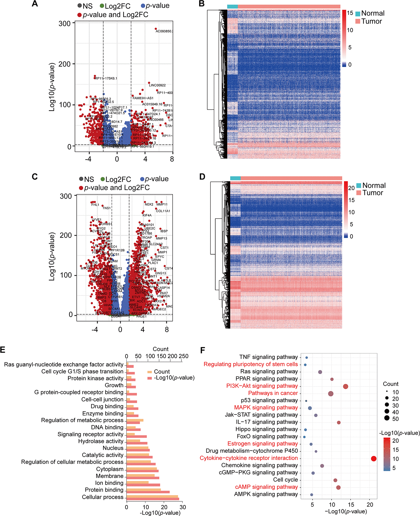 Figure 1. Volcano plots, heatmap, and gene enrichment analysis of DElncRNAs and DEmRNAs. (A) Volcano plot of DElncRNAs. (B) Heatmap of DElncRNAs. (C) Volcano plot of DEmRNAs. (D) Heatmap of DEmRNAs. NS: no significant, Log2FC: |Log2FC|>2, p-value: p-value<1e-3, p-value and Log2FC: p-value<1e-3 and |Log2FC|>2. (E) GO enrichment of DEmRNAs. (F) KEGG pathway enrichment of DEmRNAs. Red pathways are common with DEmRNAs of the Brown module.
