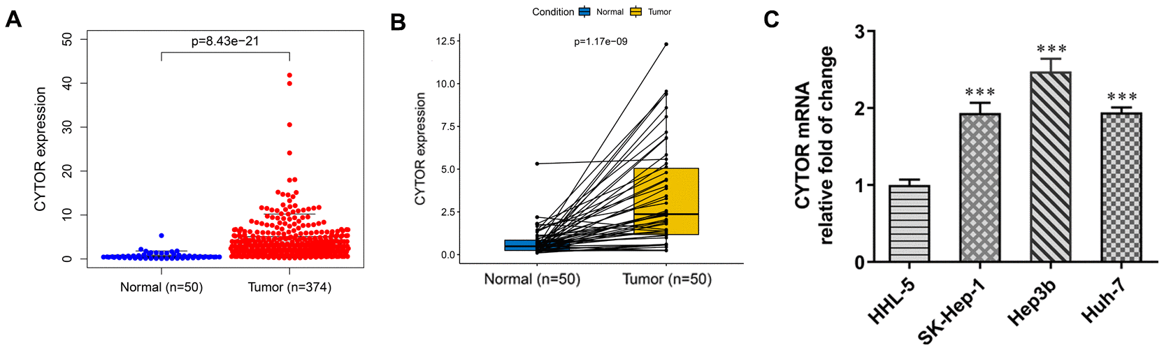 Figure 1. CYTOR expression in HCC tissues and cells. (A) CYTOR expression was increased in HCC tissues compared with normal tissues. (B) CYTOR expression was increased in HCC tissues compared with adjacent tissues. (C) CYTOR expression in HCC cells and HHL-5 cells was analyzed by RT-qPCR analysis. ***P<0.001 vs. HHL-5 group.