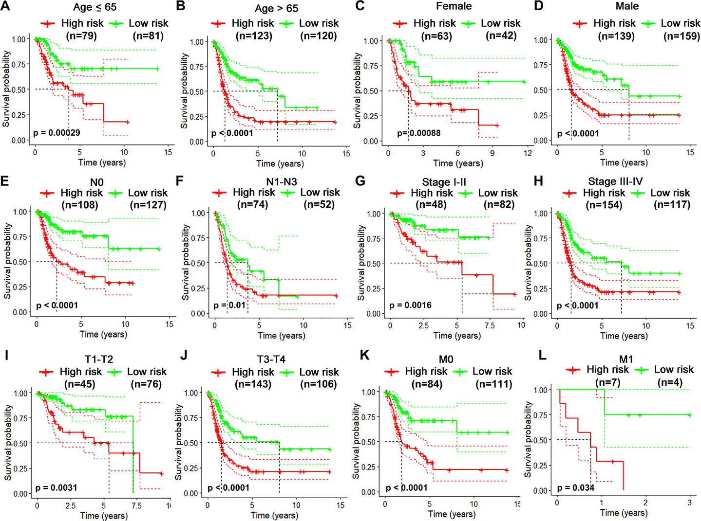 Figure 6. Risk-stratified analysis of the 10-gene signature for overall survival of bladder cancer patients. Kaplan-Meier curves for overall survival of patients in Age (≤65-year-old) subgroup (A), Age (>65-year-old) group (B), Female subgroup (C), Male subgroup (D), N0 subgroup (E), N1-N3 subgroup (F), clinical stage I-II subgroup (G), clinical stage III-IV subgroup (H), T1-2 subgroup (I), T3-4 subgroup (J), M0 subgroup (K), M1 subgroup (L).