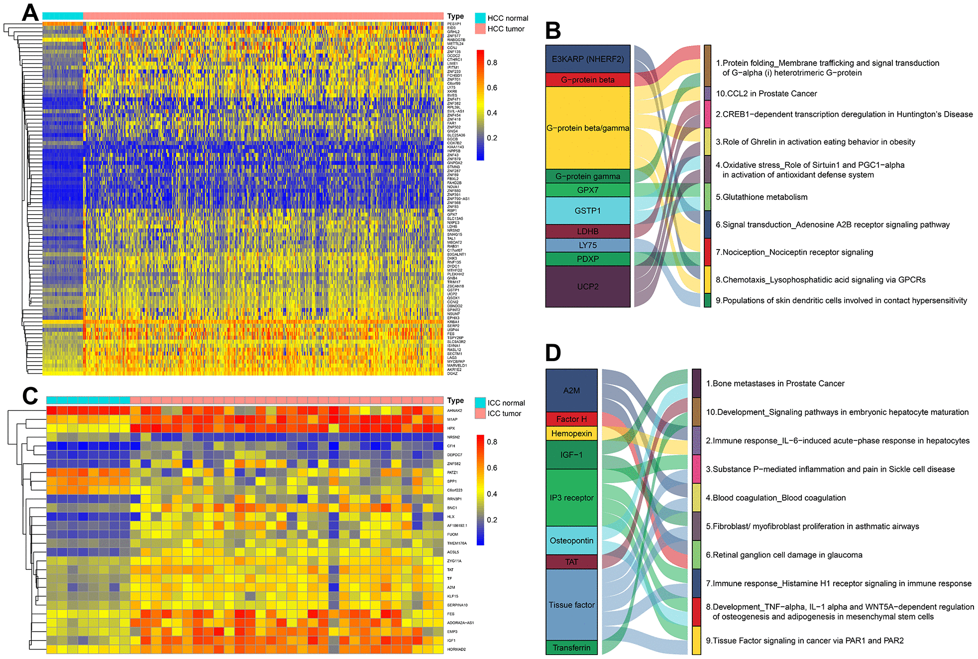 Figure 4. The methylation heatmaps and enrichment pathways of DNA methylation-driven genes. The methylation heatmap of DNA Methylation-Driven Genes in HCC (A) and ICC (C). The enrichment pathways of DNA Methylation-Driven Genes in HCC (B) and ICC (D).
