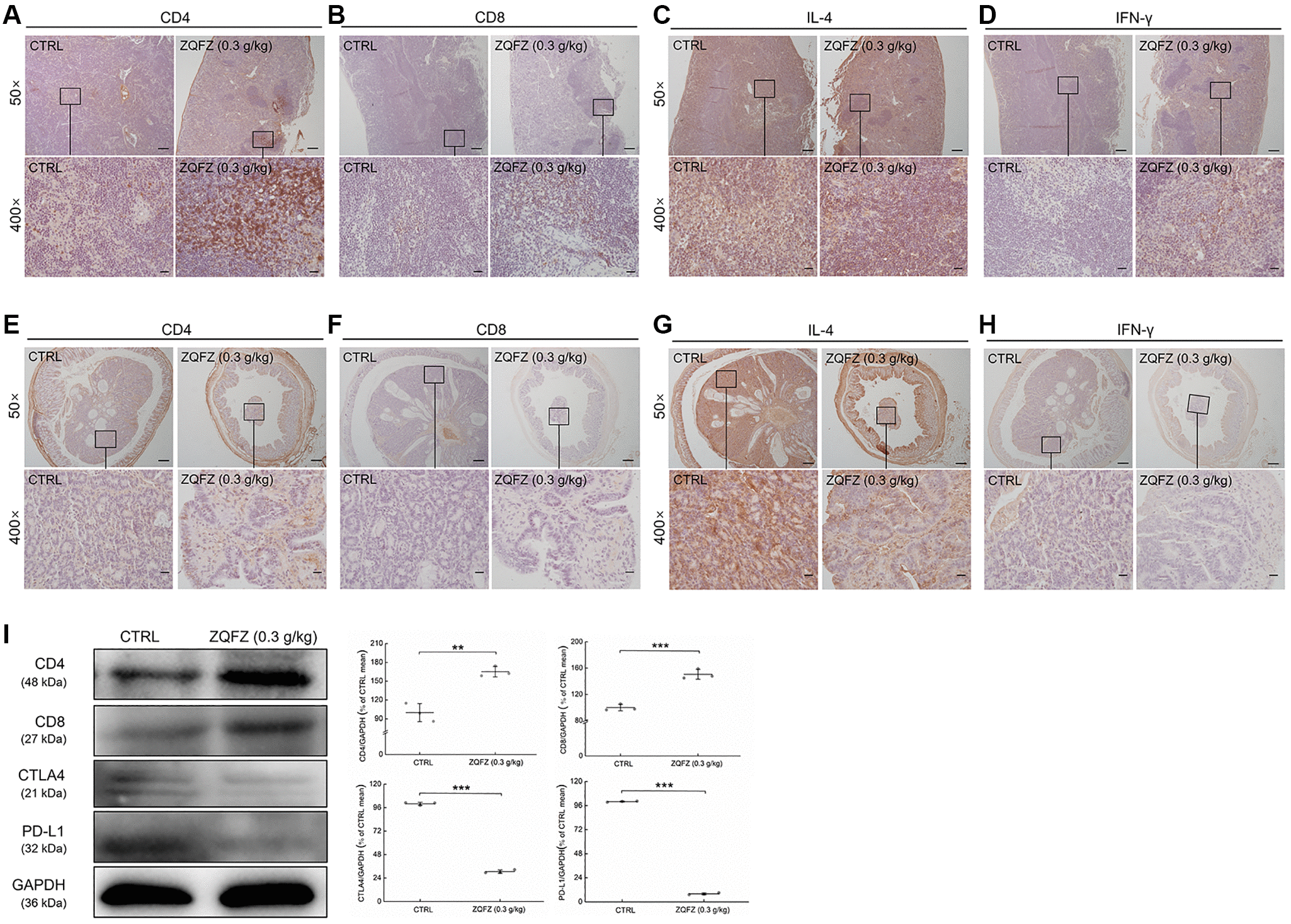 Figure 5. ZQFZ regulated immune-related proteins of spleen and colorectum in ApcMin/+ mice. Base on the result of immunohistochemical staining, ZQFZ enhanced (A) CD4 and (B) CD8, no affect (C) IL-4, and enhanced (D) IFN-γ in spleen, and enhanced (E) CD4 and (F) CD8, no affect (G) IL-4, and enhanced (H) IFN-γ in colorectal tumors (50×, scale bar: 200 μm; 400×, scale bar: 20 μm). The protein expression levels of (I) CD4, CD8, CTLA4 and PD-L1 in colorectal tumor were detected by western blotting. The quantitative data of the protein expression levels were normalized by GAPDH expressions and were shown as a percentage of the corresponding relative intensity of the CTRL group. Data are shown as the mean ± SD and analyzed via a one-way ANOVA test. (n = 3). **p < 0.01 and ***p < 0.001 vs. CTRL group.