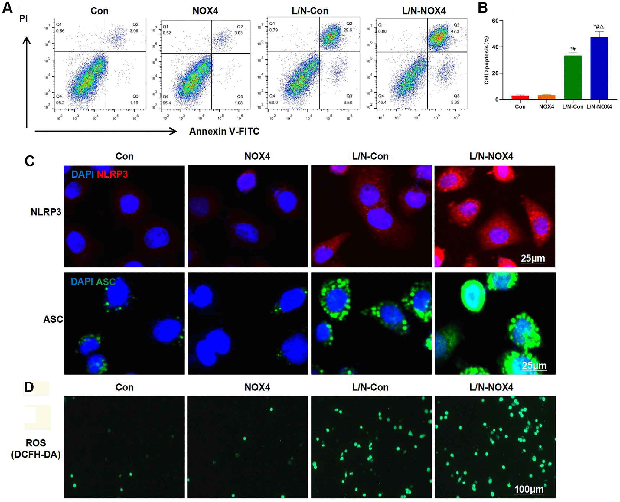 Figure 1. NOX4 promotes inflammatory injury in KCs. (A, B) Results of FCM assay (n = 3). The cell apoptosis levels in Con and NOX4 groups were relatively low, with no obvious inflammatory injury. Obvious cell apoptosis was observed in L/N-Con group, and the apoptosis rate was higher than that in Con and NOX4 groups. The cell apoptosis rate in L/N-Con group was further up-regulated, higher than that in L/N-Con group. *P < 0.05, compared with Con group; #P < 0.05, compared with NOX4 group; △P < 0.05, compared with L/N-Con group. (C) Results of IF staining (n = 3). L/N promoted the activation of NLRP3 inflammasome, and the levels of NLRP3 and ASC increased. The levels NLRP3 and ASC further increased in L/N-NOX4 group, higher than those in L/N-Con group. (D) ROS detection by the DCFH-DA probe (n = 3). The numbers of positive cells in Con and NOX4 groups decreased, that in L/N group increased, and that in L/N-NOX4 group further increased, indicating that NOX4 promoted ROS expression under the inflammatory condition.