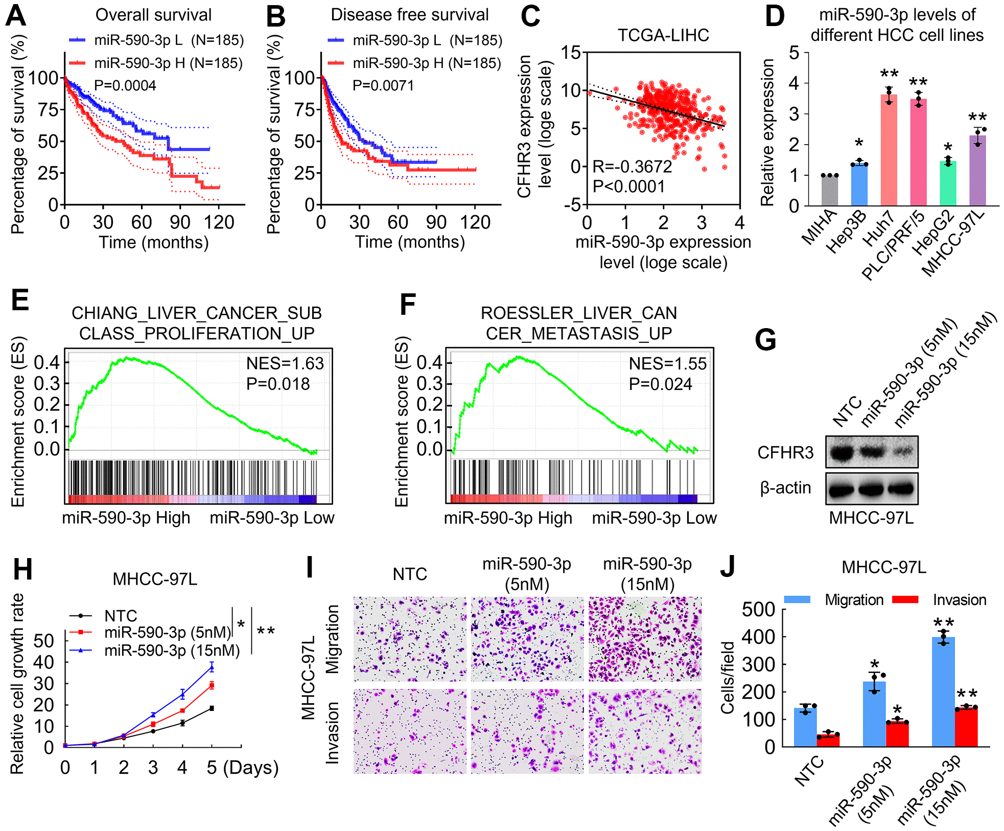Figure 3. CFHR3 is a critical effector for miR-590-3p in the regulation of HCC cell malignant phenotypes. (A, B) The difference for OS rates (A) or DFS rates (B) between HCC patients with low and high miR-590-3p levels in HCC tissues is shown as a survival curve, respectively. (C) An analysis shows linear regressions and Pearson correlations between CFHR3 and miR-590-3p levels in HCC tissues in the TCGA database. (D) The levels of miR-590-3p in five HCC cell lines and normal liver cells (MIHA) were determined by qPCR. (E, F) GSEA plots show enrichment of gene signatures associated with the liver cancer proliferation and metastasis in HCC tissues with a miR-590-3p high as compared with miR-590-3p low (E, Chiang Liver Cancer Subclass Proliferation Up; F, Roessler Liver Cancer Metastasis Up). (G–J) MHCC-97L cells were treated with the indicated concentration of miR-590-3p precursor, and CFHR3 protein levels (G), cell growth (H), migration, and invasion (I, J) were determined. (Remarks: * represents P < 0.05; ** represents P < 0.01; Data are presented as mean ± SD).
