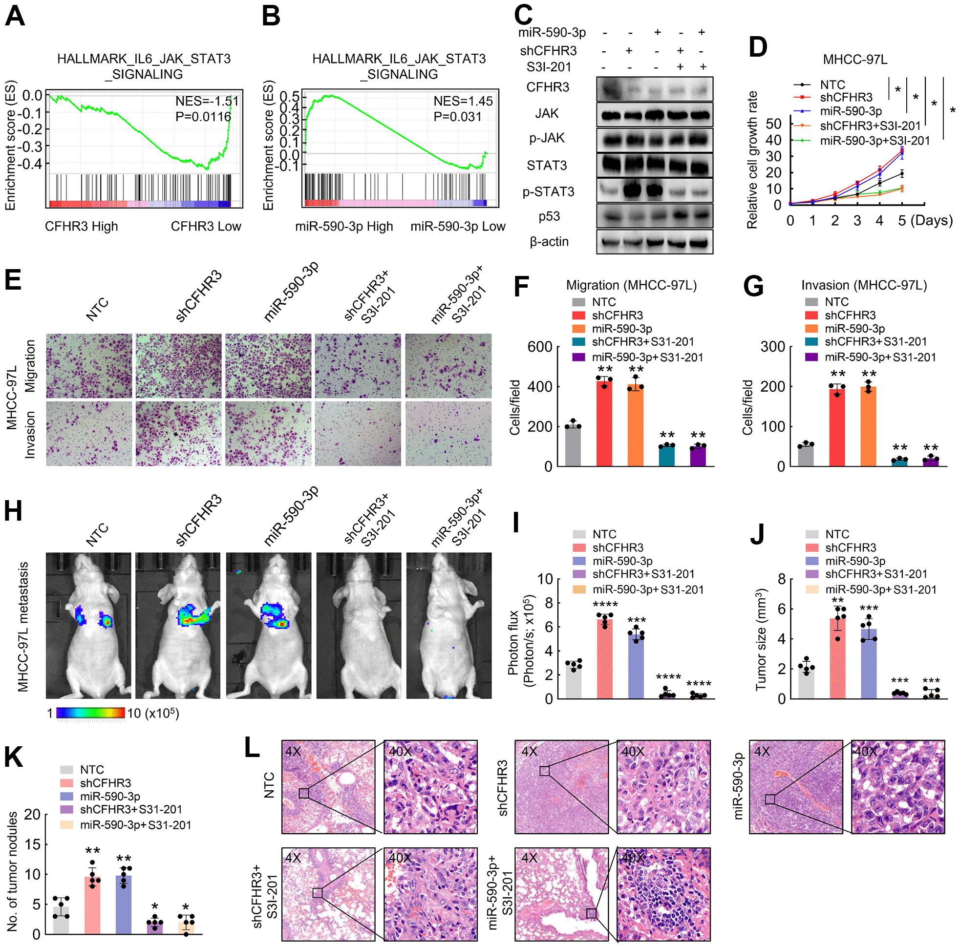 Figure 5. CFHR3 downregulation promotes phosphorylation of STAT3 and (A, B) GSEA plots show the enrichment of genes in response to JAK/STAT3 signaling between the HCC tissues with CFHR3high and CFHR3low (A), or between the HCC tissues with miR-590-3phigh and miR-590-3plow (B). (C–G) MHCC-97L cells transfected with shCFHR3-RNAs or miR-590-3p precursor were treated with S3I-201 (50μM) or DMSO (control) for 8 hours, and the indicated protein levels (C), cell growth (D), migration and invasion (E–G) were investigated. (H, I) The indicated luciferase-labeled MHCC-97L cells (2 × 106 cells/mouse) were injected into NOD-SCID mice (H); the luciferase activity was visualized 6 weeks post-transplantation (I, n = 5) (J, K) The tumor size (J) and number (K) of metastatic tumor nodules in mouse lung were observed and shown in a bar chart, respectively. (L) Representative IHC images of mouse metastatic tumors formed by MHCC-97L cells. (Remarks: * represents P < 0.05; ** represents P < 0.01; *** represents P < 0.001; **** represents P < 0.0001; Data are presented as mean ± SD).