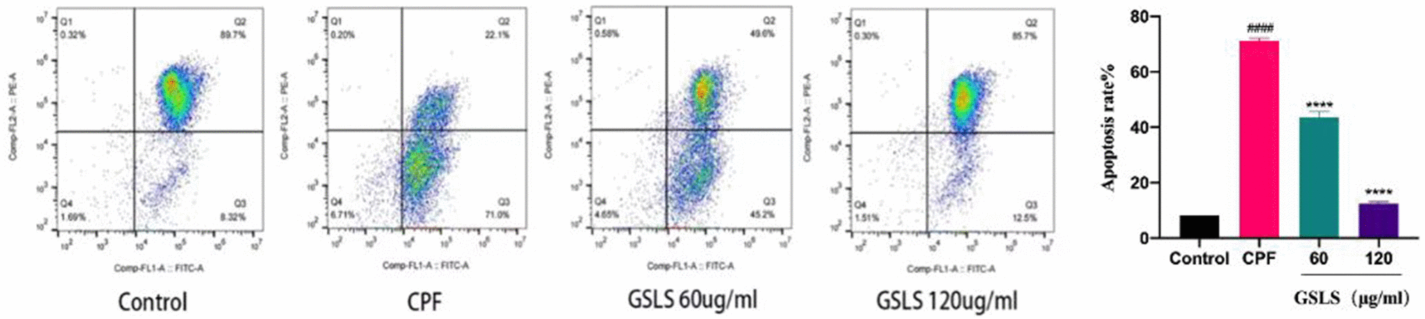 Figure 5.The detection results of mitochondrial membrane potential (Δψm). The Δψm staining of each group was JC-1 by flow cytometry. #p < 0.05, ##p < 0.01 vs. control group; *p < 0.05, **p < 0.01 vs. CPF group.