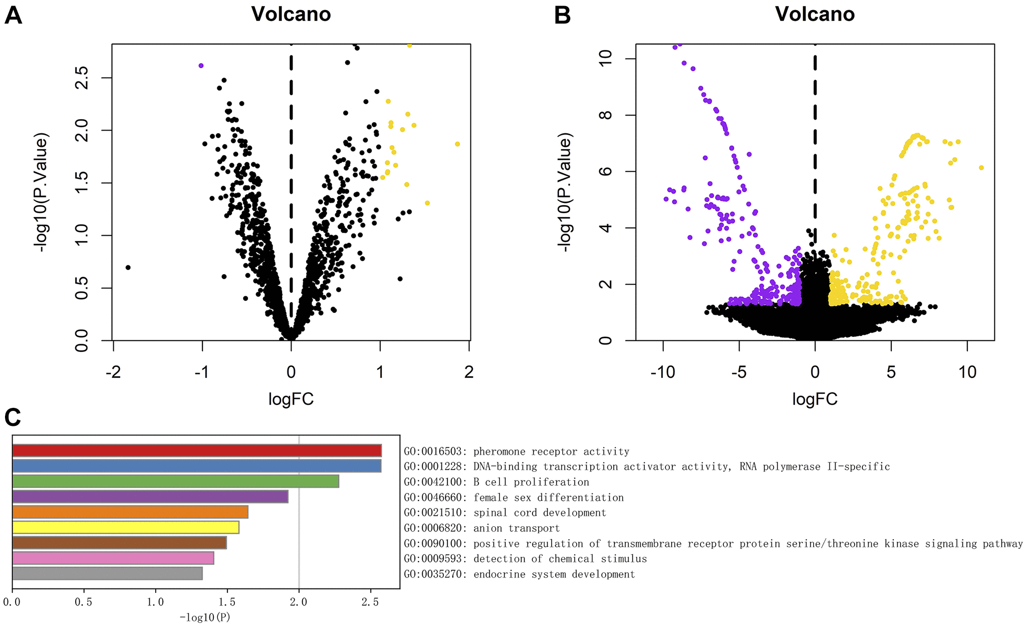 Figure 3. (A) Volcanic diagram of differential analysis of circRNA; (B) Volcanic map of mRNA differences detected in the experiment. The yellow dot represents the up-regulated genes, the purple dot represents the down-regulated genes, the abscissa is the log2 change multiple, and the ordinate is P-value. (C) Analysis of enrichment function of 530 differentially expressed genes, The length of the column represents the size of P-value.