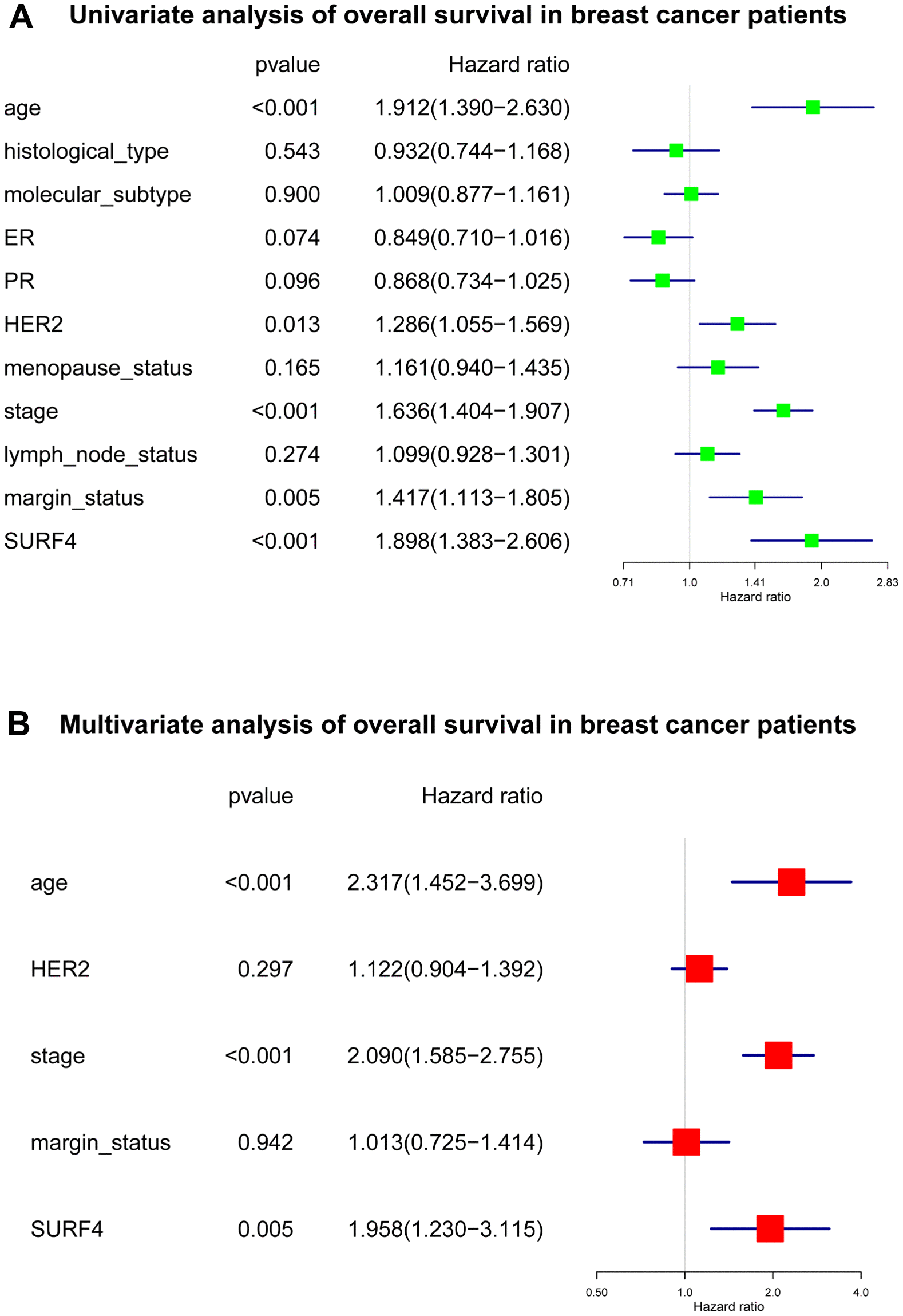 Figure 5.Forest plot of Cox regression analysis about SURF4 and OS. (A) Univariate analysis of OS in breast cancer patients. (B) Multivariate analysis of OS in breast cancer patients.