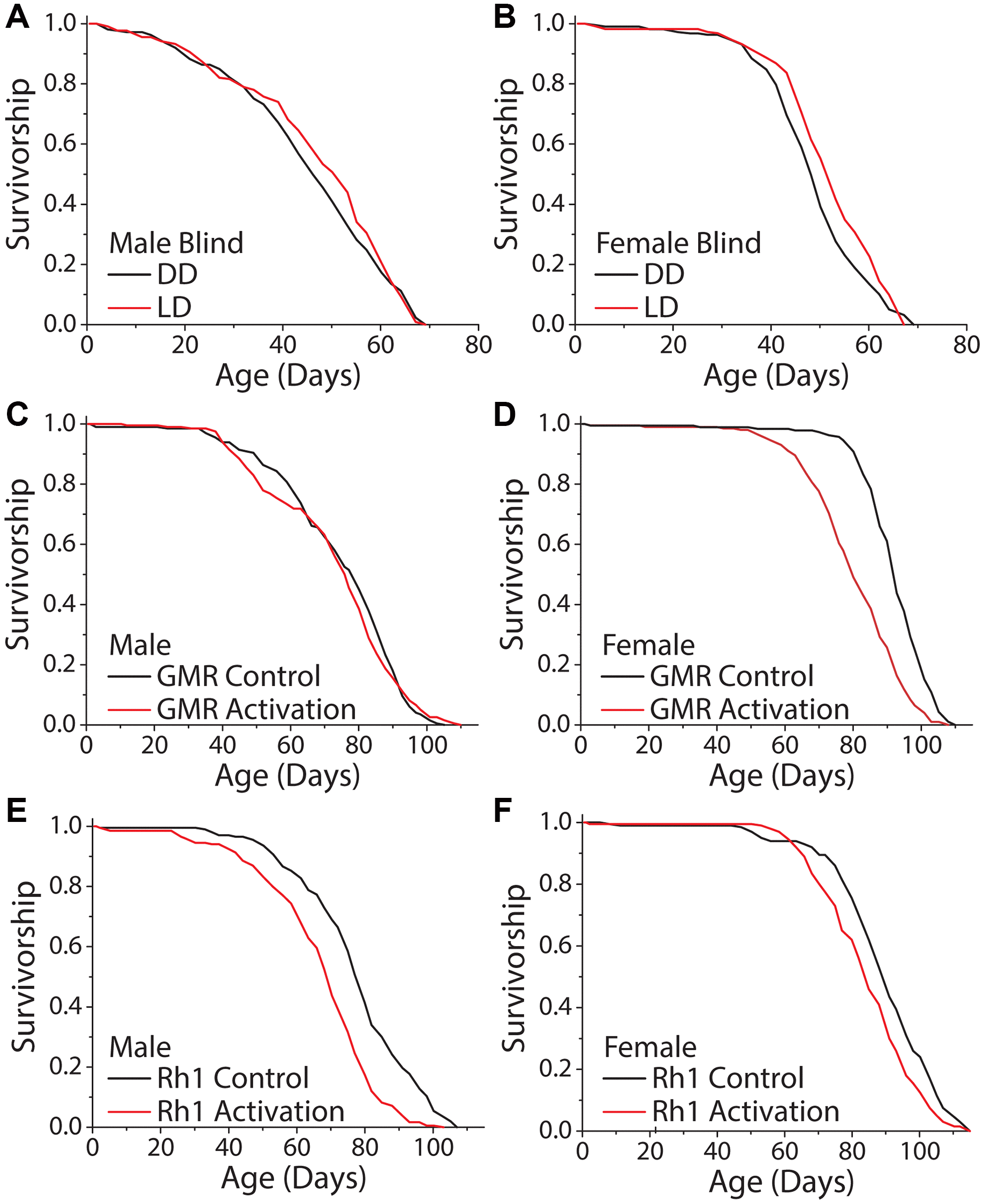 Figure 3. Activation of visual neurons is necessary and sufficient to mediate the dark lifespan extension. (A, B) Flies carrying two copies of the GMR:hid transgene, which lack light perception, failed to exhibit an extended lifespan in constant darkness (A) males (LD n = 213, DD n = 223; P = 0.288) and (B) females (LD n = 222, DD n = 217; P = 0.006). The next 4 panels were conducted in an environment meant to mimic light perception in a standard 24-hour day. Flies carrying a copy of a temperature sensitive cation channel (UAS-TrpA1) were used to obtain neuronal activation when at 29°C, and the Gal4 lines were used as background controls. Flies were aged in constant darkness with temperature oscillating 12 hr: 12 hr, 18°C: 29°C. (C, D) When aged in constant darkness, activation of GMR-expressing neurons had no effect in male flies (C) (GMR-Gal4 x w1118 n = 200, GMR-Gal4 x UAS-TrpA1 n = 198; P = 0.388) but was sufficient to shorten lifespan in females (D) (GMR-Gal4 x w1118 n = 189, GMR-Gal4 x UAS-TrpA1 n = 202; P < 0.0001). (E, F) Similarly, spatiotemporal activation of blue light photoreceptor Rh1 neurons was sufficient to cause a significantly shorter lifespan. This was observed in both male (E) (Rh1-Gal4 x w1118 n = 202, Rh1-Gal4 x UAS-TrpA1 n = 203; P < 0.0001), and female flies (Rh1-Gal4 x w1118 n = 200, Rh1-Gal4 x UAS-TrpA1 n = 200; P = 0.0002).