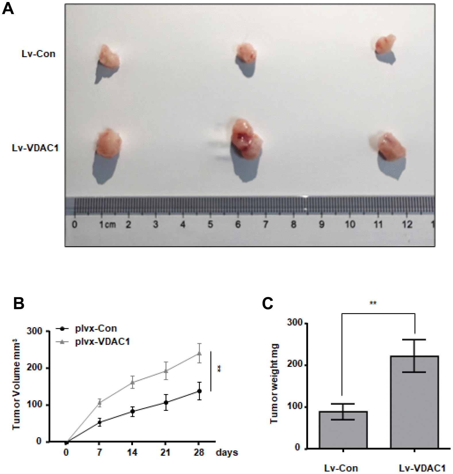 Figure 3. VDAC1 promotes breast cancer growth in vivo. Subcutaneous xenografts of MCF7 cells infected with VDAC1 overexpressing lentivirus or control lentivirus. (A) Images of the tumors at autopsy from nude mice are presented. (B, C) Tumor volumes (B) and average weight (C) of xenografted tumors were measured. Data represent the means ± S.D. **P < 0.01.