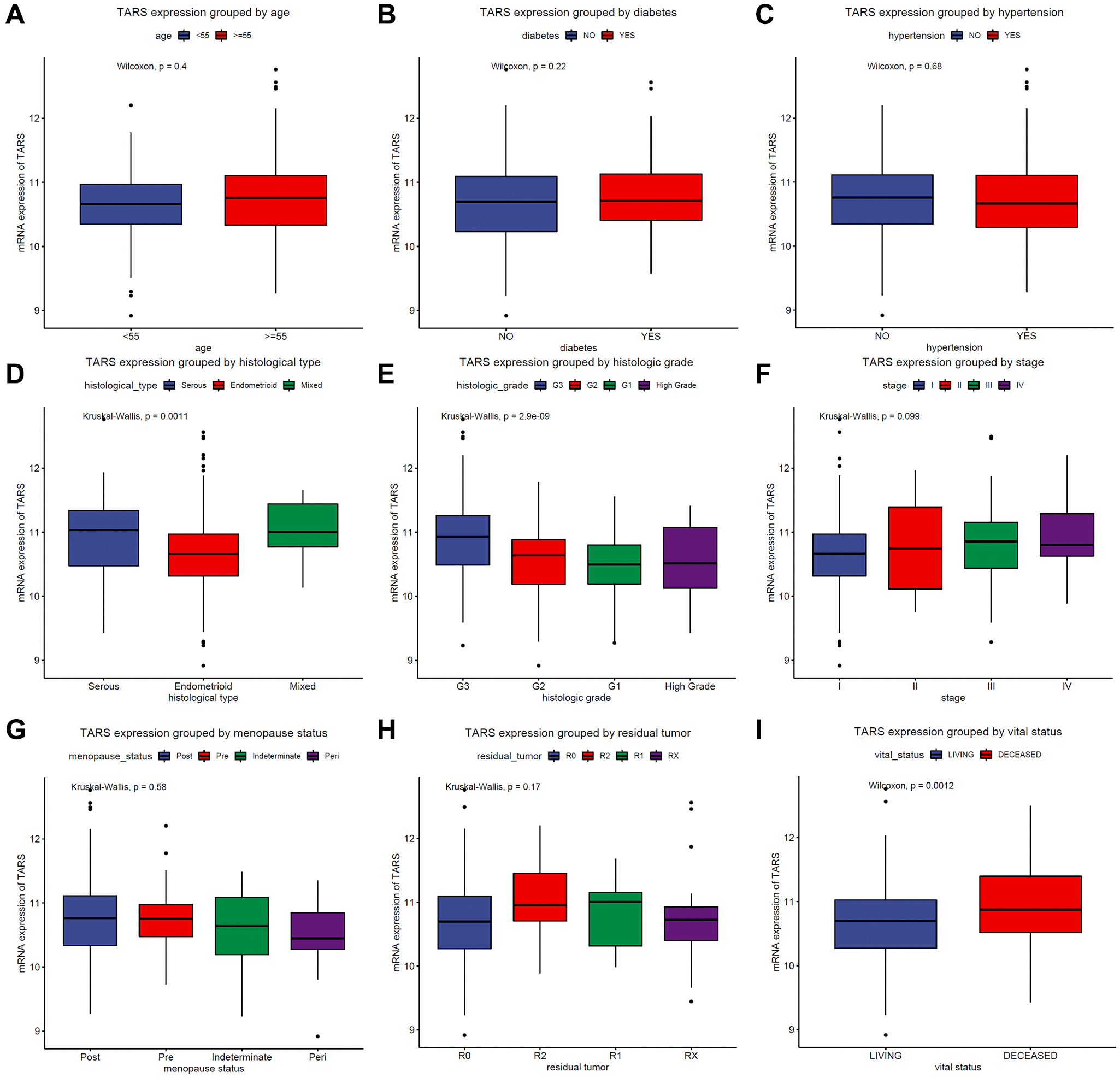 Figure 2. TARS expression in subgroups. TARS expression grouped by (A) age, (B) diabetes, (C) hypertension, (D) histological type, (E) histologic grade, (F) stages, (G) menopause status, (H) residual tumor, and (I) vital status.