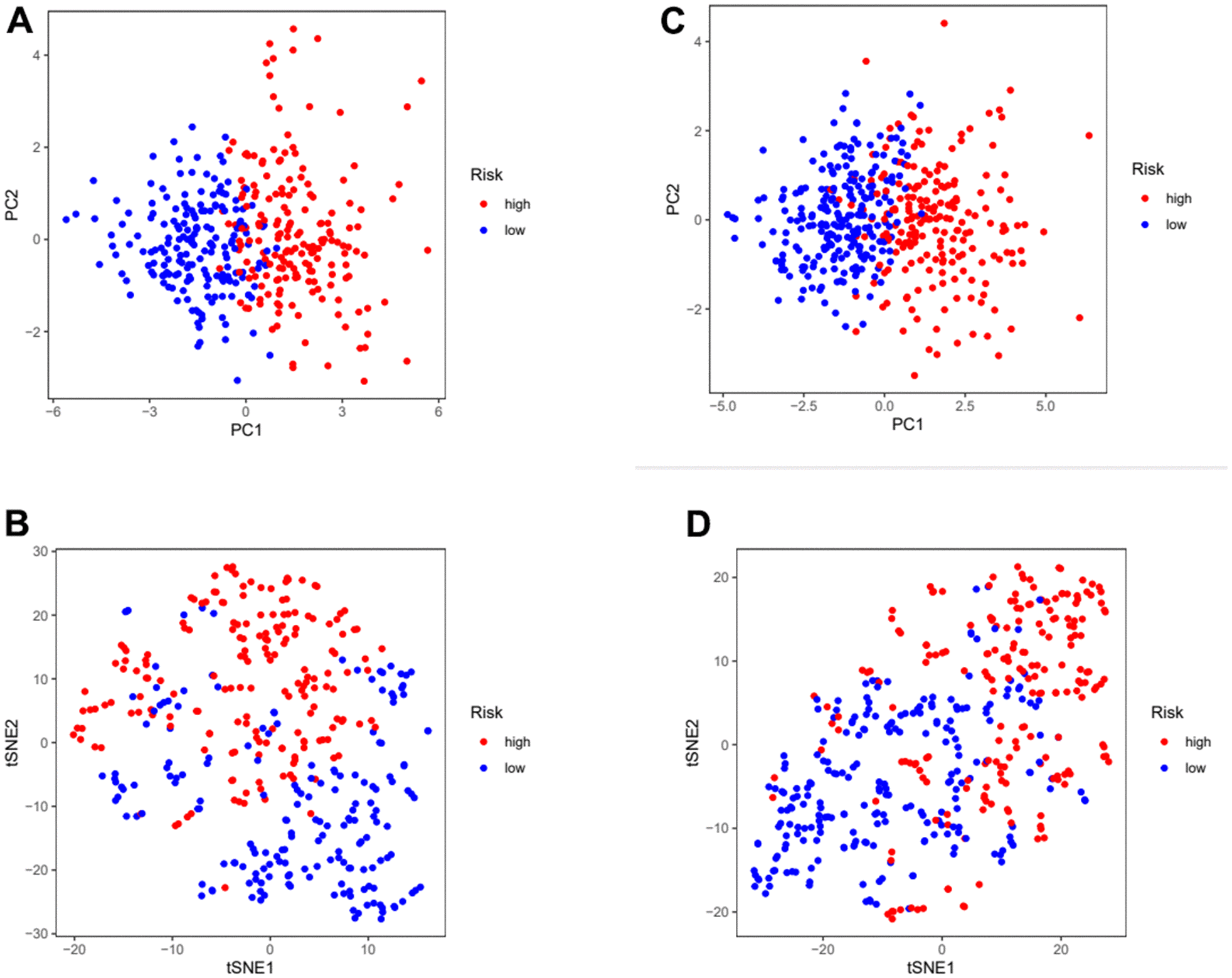 Figure 5. Assess the ability of risk scores to differentiate patients in high and low risk group. (A, B) PCA and tSNE assessed the ability of risk scores to distinguish between high and low risk groups of patients in the TCGA cohorts. (C, D) PCA and tSNE assessed the ability of risk scores to distinguish between high and low risk groups of patients in the GEOcohorts. PCA: principal components analysis; tSNE: t-distributed stochastic neighbor embedding.