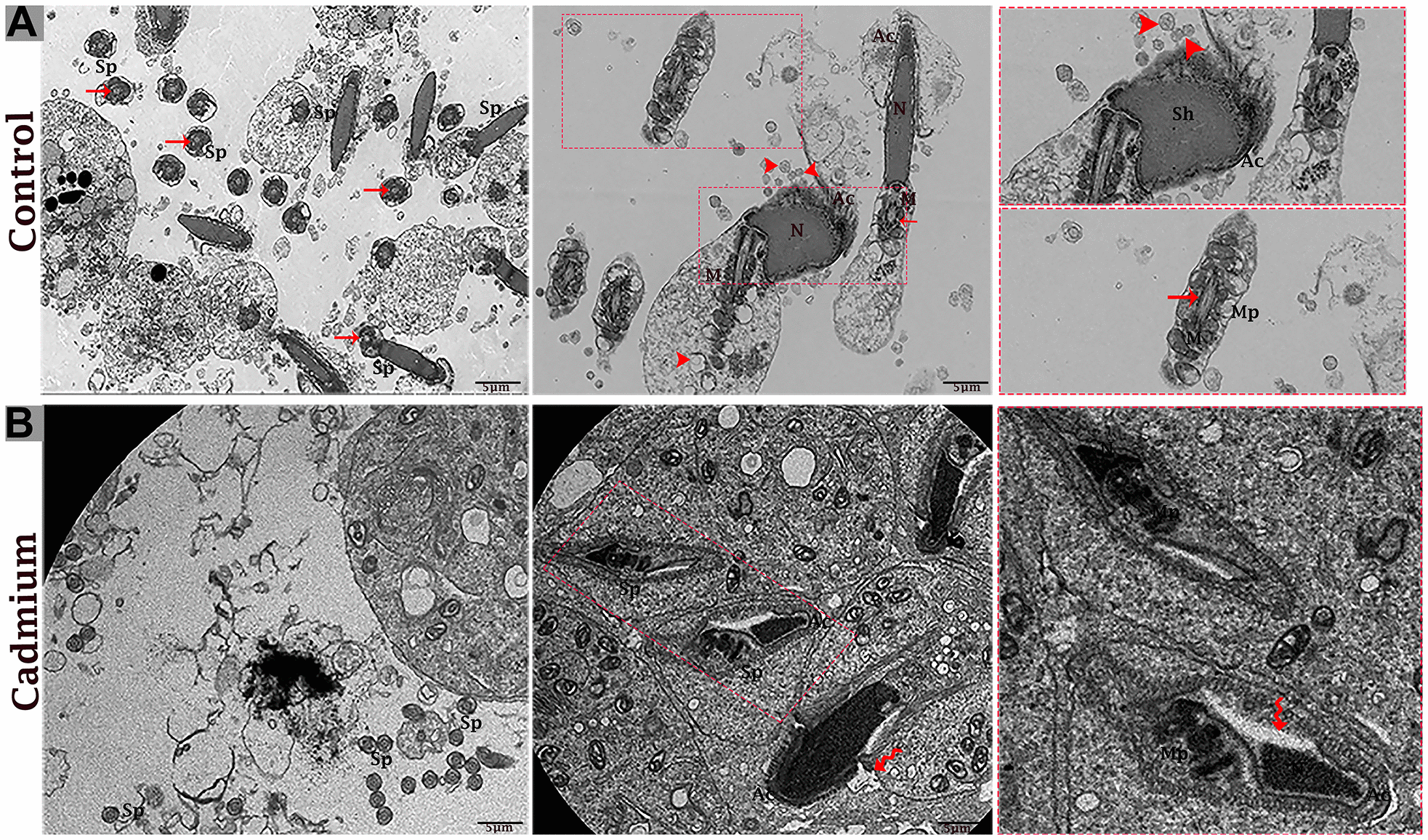 Figure 6. Electron micrograph of spermatozoa of control (A) and cadmium treated (B) group. (A) Healthy spermatozoa were observed in luminal compartment of seminiferous tubules. (B) Destructive spermatozoa were observed in luminal compartment of seminiferous tubules. Sp: spermatozoa; Sh: sperm head; Mp: mid-peace; N: nucleus; Ac: acrosome reaction; M: mitochondria; (arrow head) exosome; (arrow) axonema; (curved arrow) vacuolation. Scale bars 5 μm.