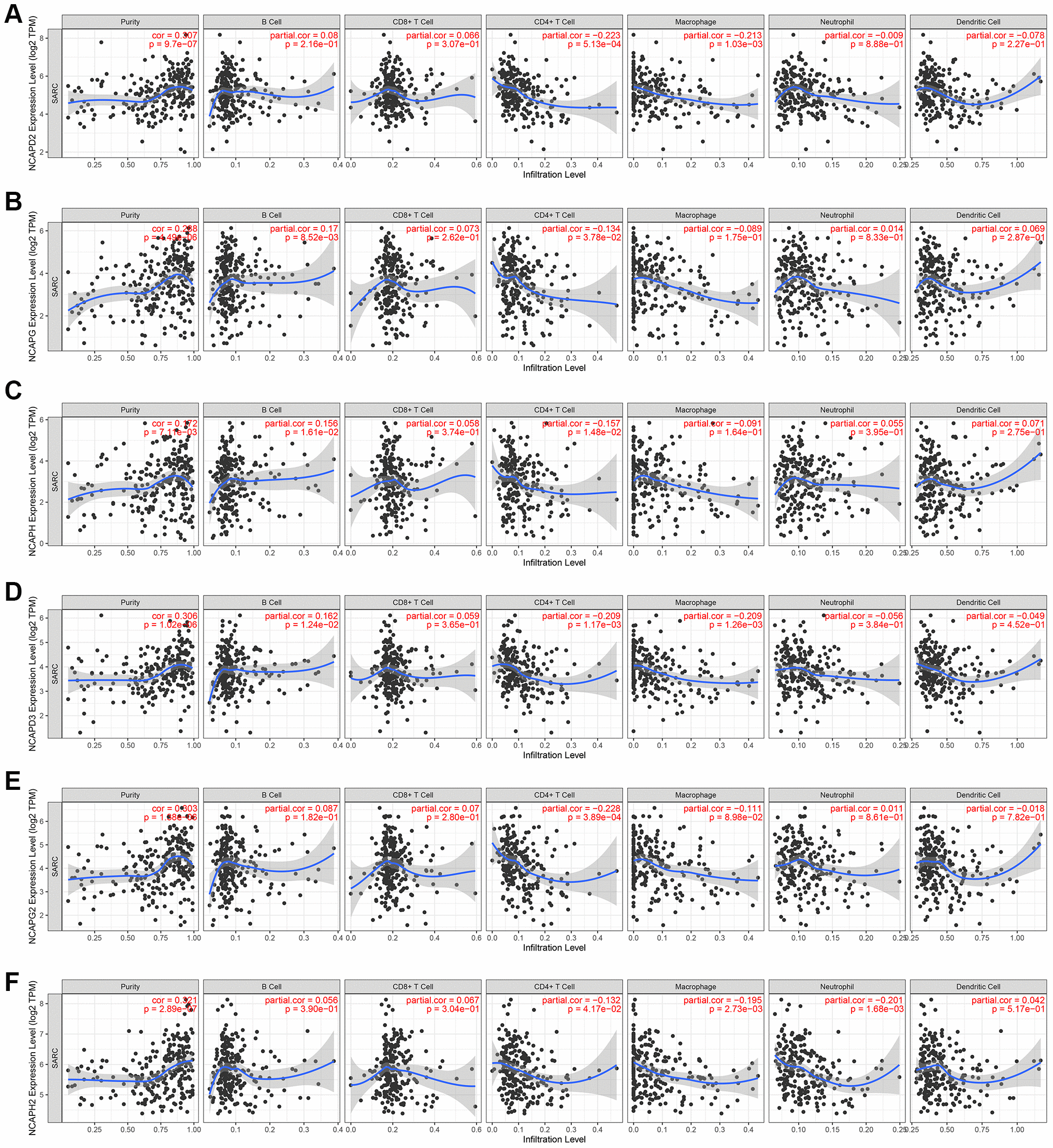 Figure 7. Analysis of immune infiltration. Relationship of differentially expressed (A–F) NCAPD2, NCAPG, NCAPH, NCAPD3, NCAPG2, and NCAPH2 with immune cell infiltration. The immune cells we analyzed included B cells, CD8+ T cells, CD4+ T cells, macrophages, neutrophils, and dendritic cells.