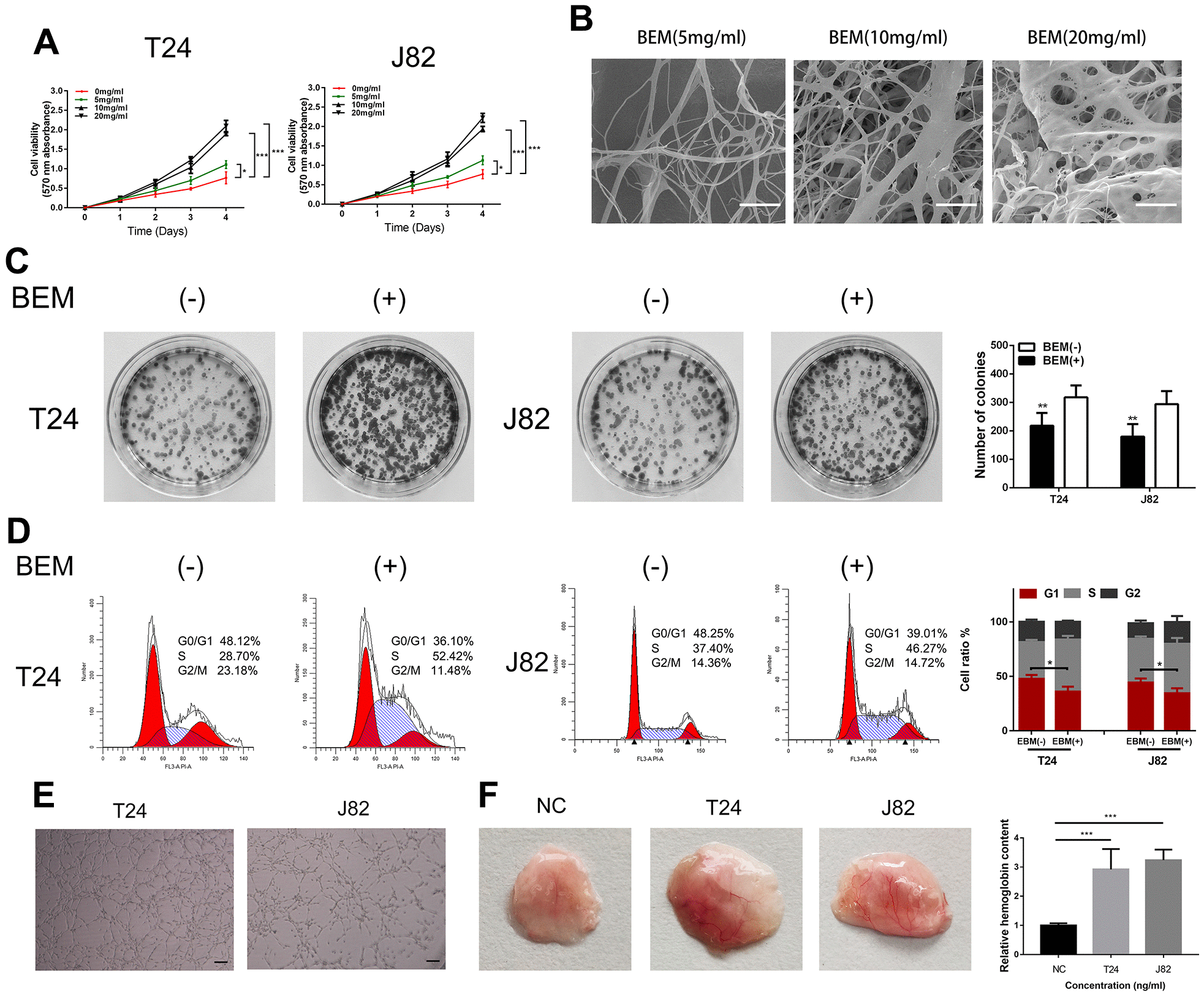 Figure 2. BEM induces cell proliferation and angiogenesis in bladder cancer cells. (A) Cell viability of T24 and J82 cells incubated with BEM hydrogels (0, 5, 10, and 20 mg/mL) for 4 days was evaluated using the MTT assay. (B) SEM images of fibrous collagen structures in BEM hydrogels (5, 10, and 20 mg/mL). Scale bars = 100 nm. (C) Cell cycle distribution of bladder cancer cells treated with BEM hydrogels (0 and 20 mg/mL) for 48 h was evaluated by flow cytometry. The percentage of cells in each phase are shown. (E, F) HUVECs treated with T24 and J82 medium formed capillary-like structures in the, scale bar = 100 μm. *p < 0.05, **p < 0.01, ***p < 0.001.