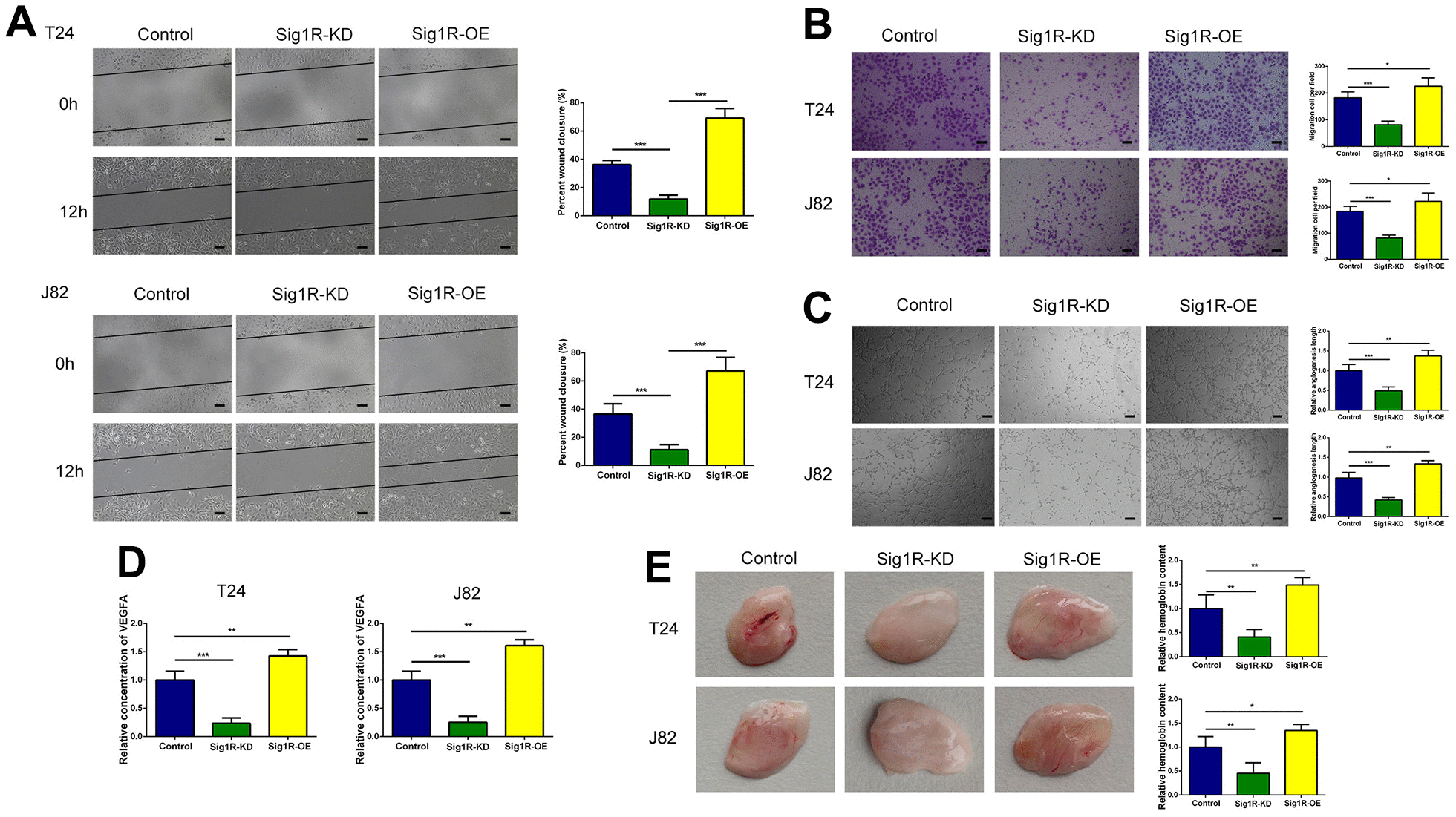 Figure 5. Sig1R enhanced the crosstalk between bladder cells and HUVECs and promoted migration and tube formation in HUVECs. (A, B) Sig1R promoted tumor-induced HUVEC migration according to wound healing and transwell migration assays, scale bar = 100 μm. (C) Sig1R promoted tumor-induced HUVEC angiogenesis according to tube formation assays in BEM in vitro, scale bar = 100 μm. (D) Quantification of VEGFA concentration in CM are shown. (E) Sig1R promoted tumor-induced HUVEC angiogenesis according to tube formation assays in BEM in vivo. *p < 0.05, **p < 0.01, and ***p < 0.001.