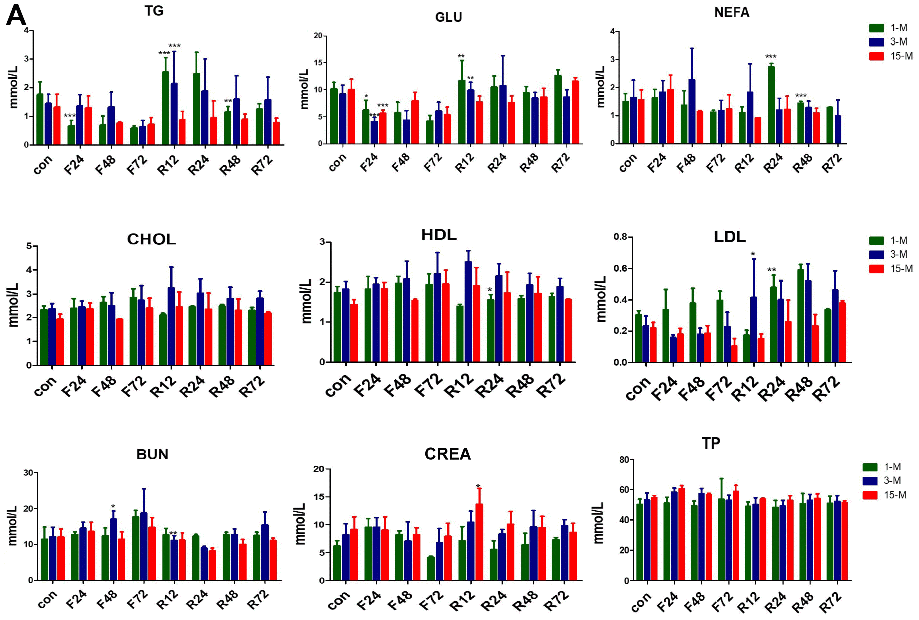 Figure 4.Serum concentrations of metabolites in the three groups of mice subjected to fasting and refeeding. (A) All data are presented as the mean ± SEM. * p < 0.05; ** p < 0.01; *** p <0.001.