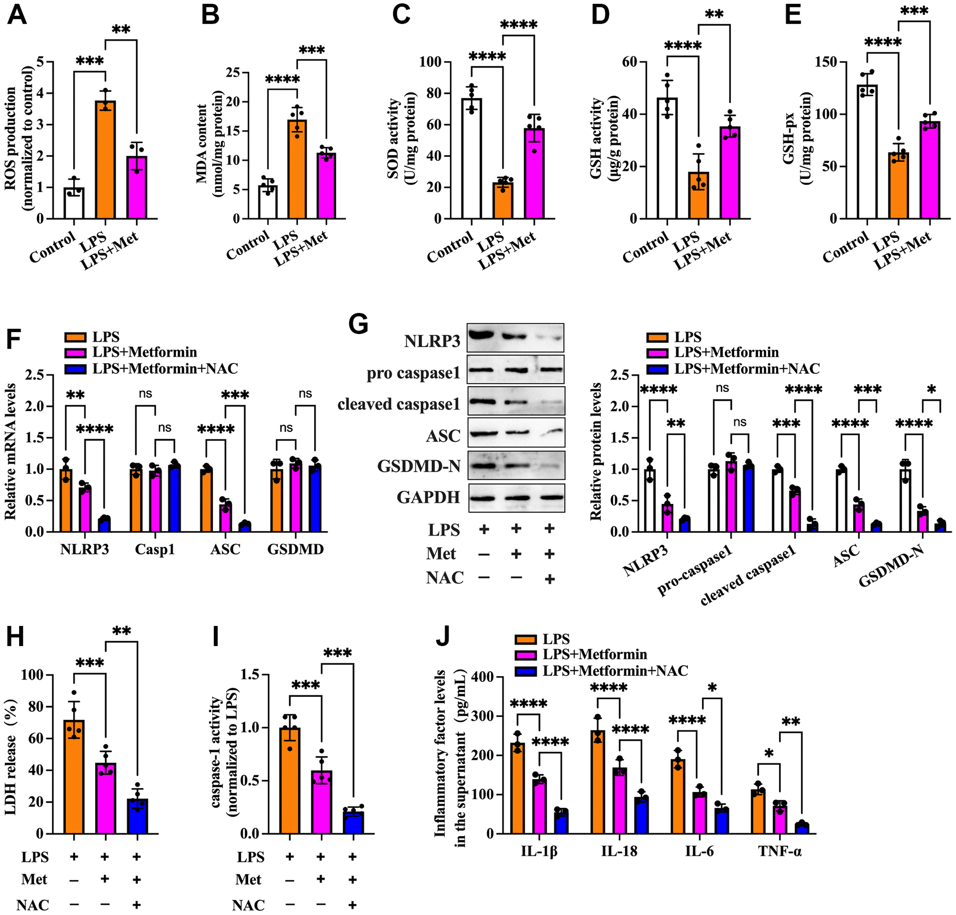Figure 2. Metformin inhibits inflammation and KGN cell pyroptosis by decreasing ROS production and oxidative stress. (A–E) Cells were pretreated with or without 10 μM LPS for 24 h and then incubated with 20 μM metformin for another 12 h. Intracellular levels of ROS, MDA, SOD, GSH, and GSH-px were measured using respective commercial kits; (F–J) Cells were pretreated with 10 μM LPS for 24 h and then incubated with 20 μM metformin and 10 mM NAC for another 12 h; (F) RT-PCR detected the mRNA levels of NLRP3, caspase-1, ASC, and GSDMD; (G) The protein levels of NLRP3, pro-caspase-1, cleaved-caspase-1, ASC and GSDMD-N were detected by Western blot; (H) Levels of LDH in the cell culture medium were examined using an LDH cytotoxicity detection kit; (I) Caspase-1 activity was assessed using a colorimetric caspase-1 activity assay kit; (J) The levels of IL-1β, IL-18, IL-6, and TNF-α in the cell culture supernatant were determined by ELISA. Data are represented as the means ± SD from three independent experiments. *P < 0.05, **P < 0.01, ***P < 0.001, ****P < 0.0001, ns. not significant.
