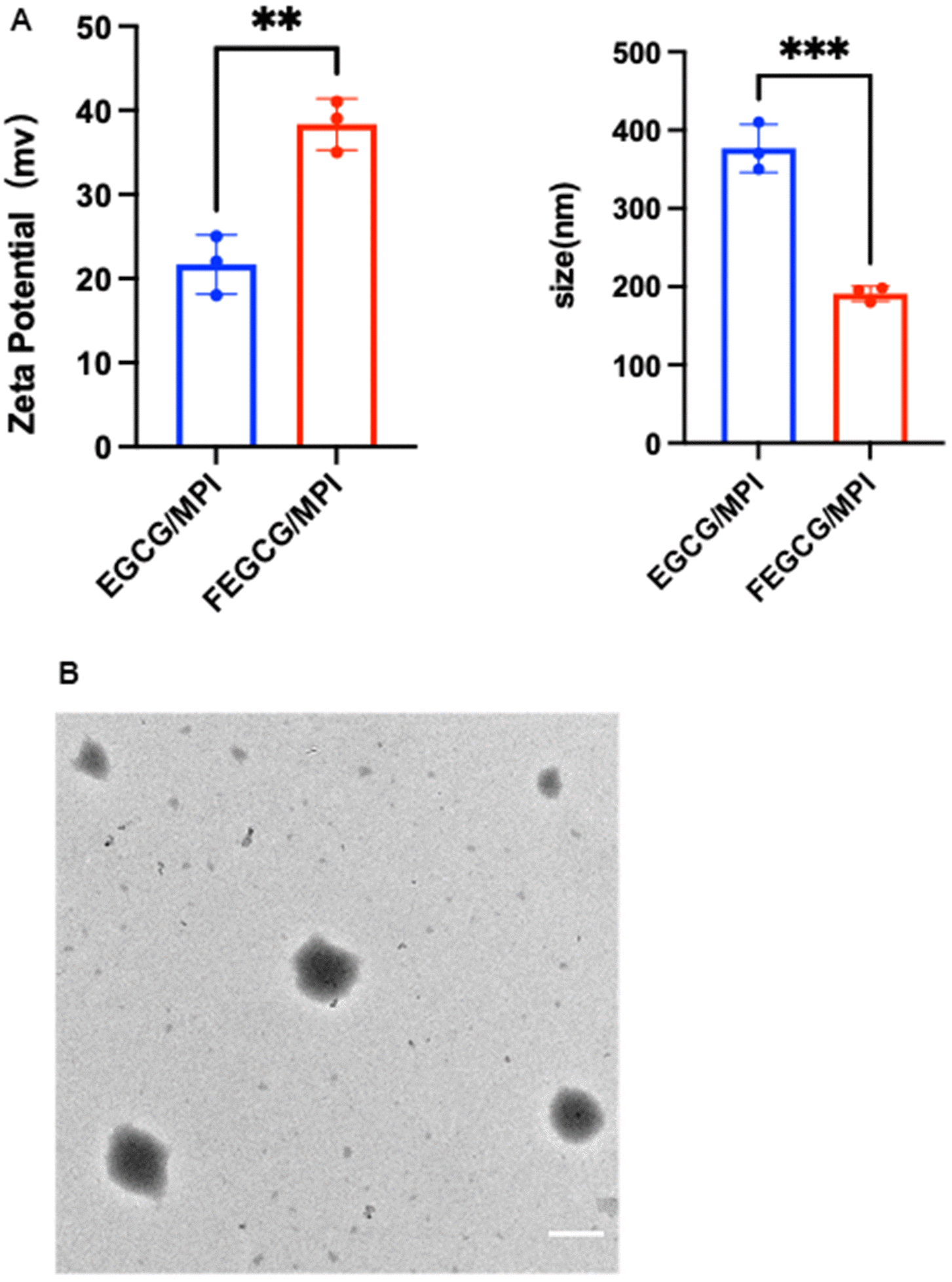 Figure 1.Characterization of FEGCG@MPI NPs. (A) Size contribution of FEGCG@MPI NPs, and EGCG@MPI NPs. Zeta potential of FEGCG@MPI NPs, and EGCG@MPI NPs. (B) TEM images of FEGCG@MPI NPs. Scale bar = 100nm.