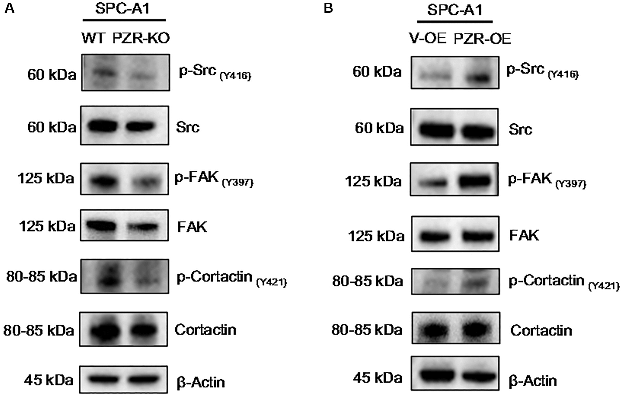 Figure 6. Altered expressions of PZR affect the phosphorylation of multiple proteins involved in cell adhesion and migration. Wild type (WT), PZR-knockout (PZR-KO), vector-overexpressing (V-OE), and PZR-overexpressing (PZR-OE) SPC-A1 cells were extracted in the RIPA buffer, and cells extract were subjected to Western blotting with the indicated antibodies. Note that knockout of PZR in SPC-A1 cells decreased phosphorylation of Src (Y416), FAK (Y397), and cortactin (Y421) (A) while overexpression of PZR had the opposite effects (B).