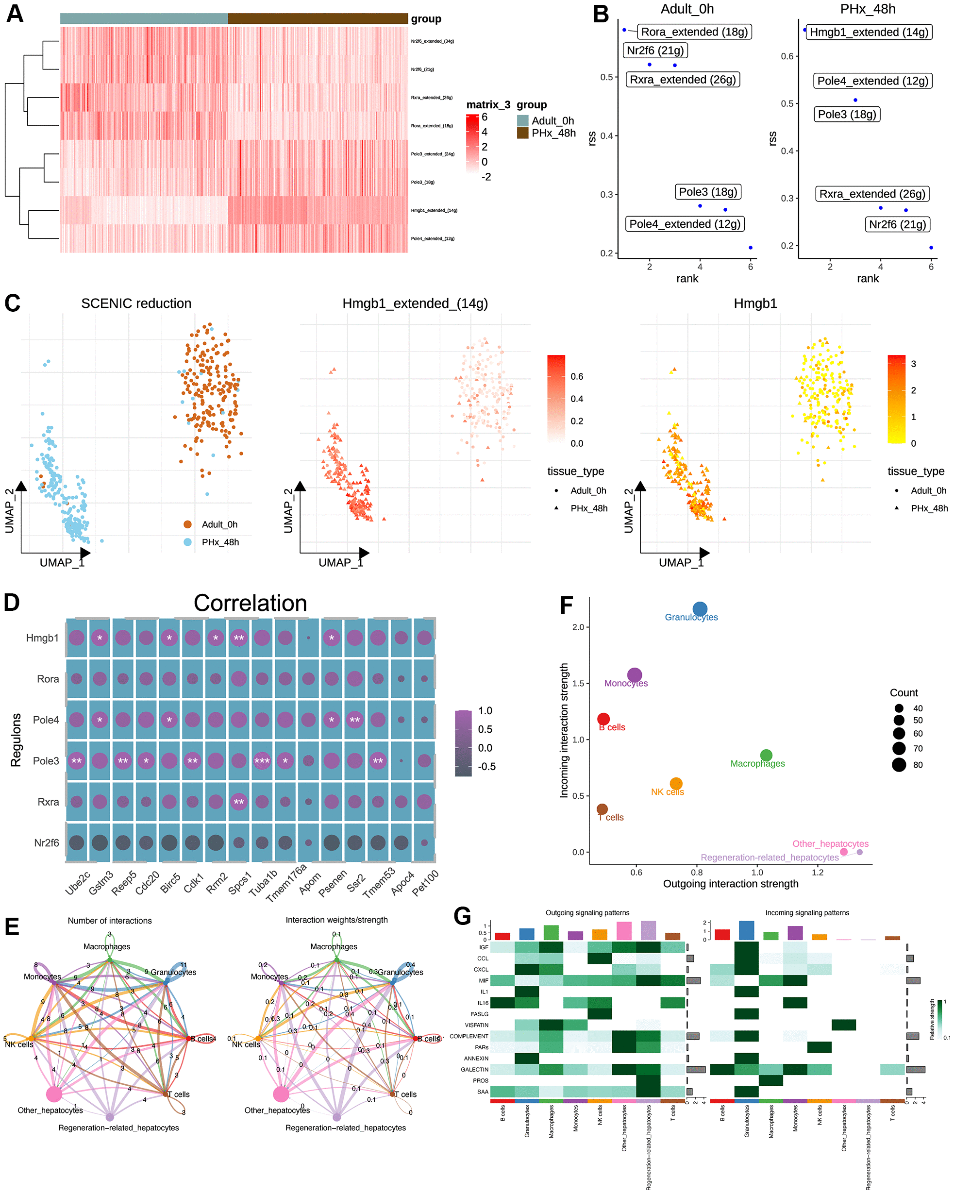 Figure 5. Transcriptional regulatory network and cell-cell communication analyses of hepatocytes. (A) Heatmap shows the differences of TFs in hepatocytes between the PHx 0h and PHx 48h groups. Only 400 hepatocytes were randomly chosen for SCENIC analysis. (B) Top activities of TFs between different groups of hepatocytes. RSS indicates Regulon Specificity Score. (C) Activity distribution of Hmgb1 and expression distribution of Hmgb1 in hepatocytes. (D) Correlation analysis of SCENIC-identified regulons and 17 machine-learning-identified feature genes in bulk RNA-seq of PHx samples. (E) Cellchat analysis of all cell types. Both interaction numbers and interaction strengths were showed. (F) Scatter plot indicates the differences of incoming and outgoing interaction strengths among all cell types. (G) Top cell cytokines were showed in heatmap across all cell types in PHx.